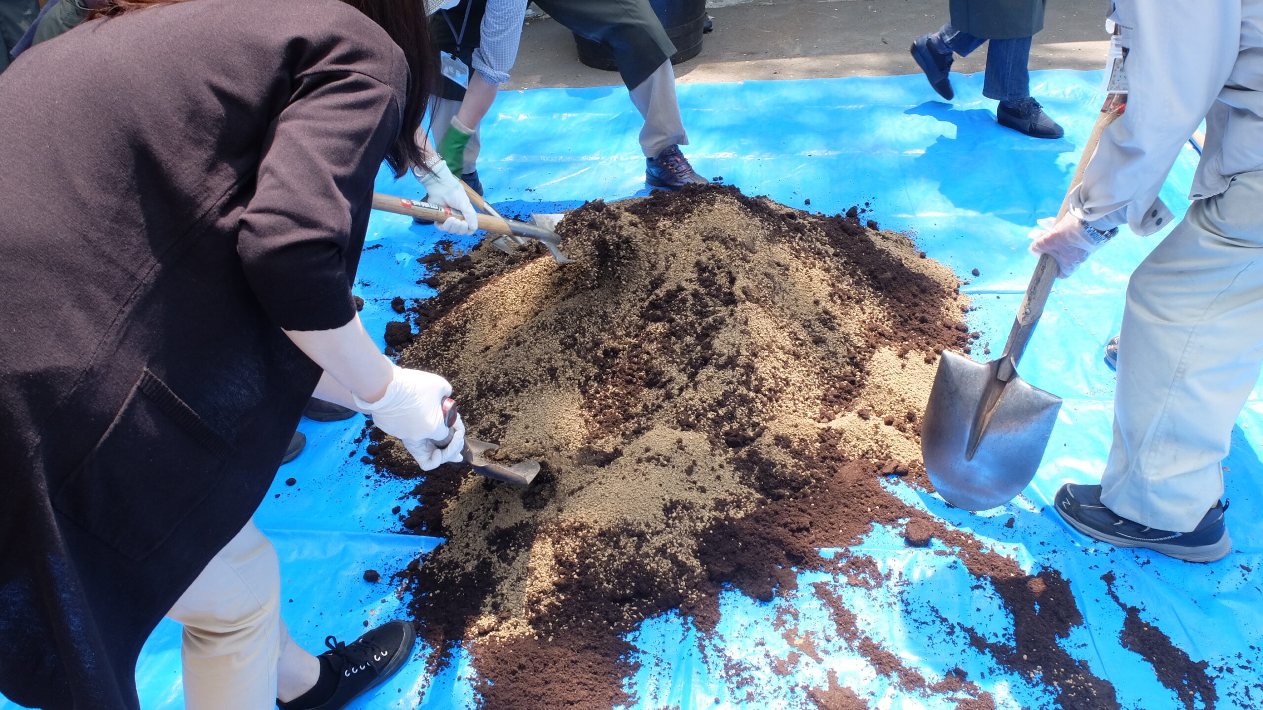 講義後は屋外に会場を移し、二人一組になって実際に1基のコンテナガーデンを作っていきます。水はけが良く、かつ水持ちの良い土にするため、今回はピートモス系の有機質用土と赤玉土を配合しました。みなさん協力して大きな袋に入った用土と緩効性肥料をブルーシートの上でスコップを使い混ぜ合わせました。