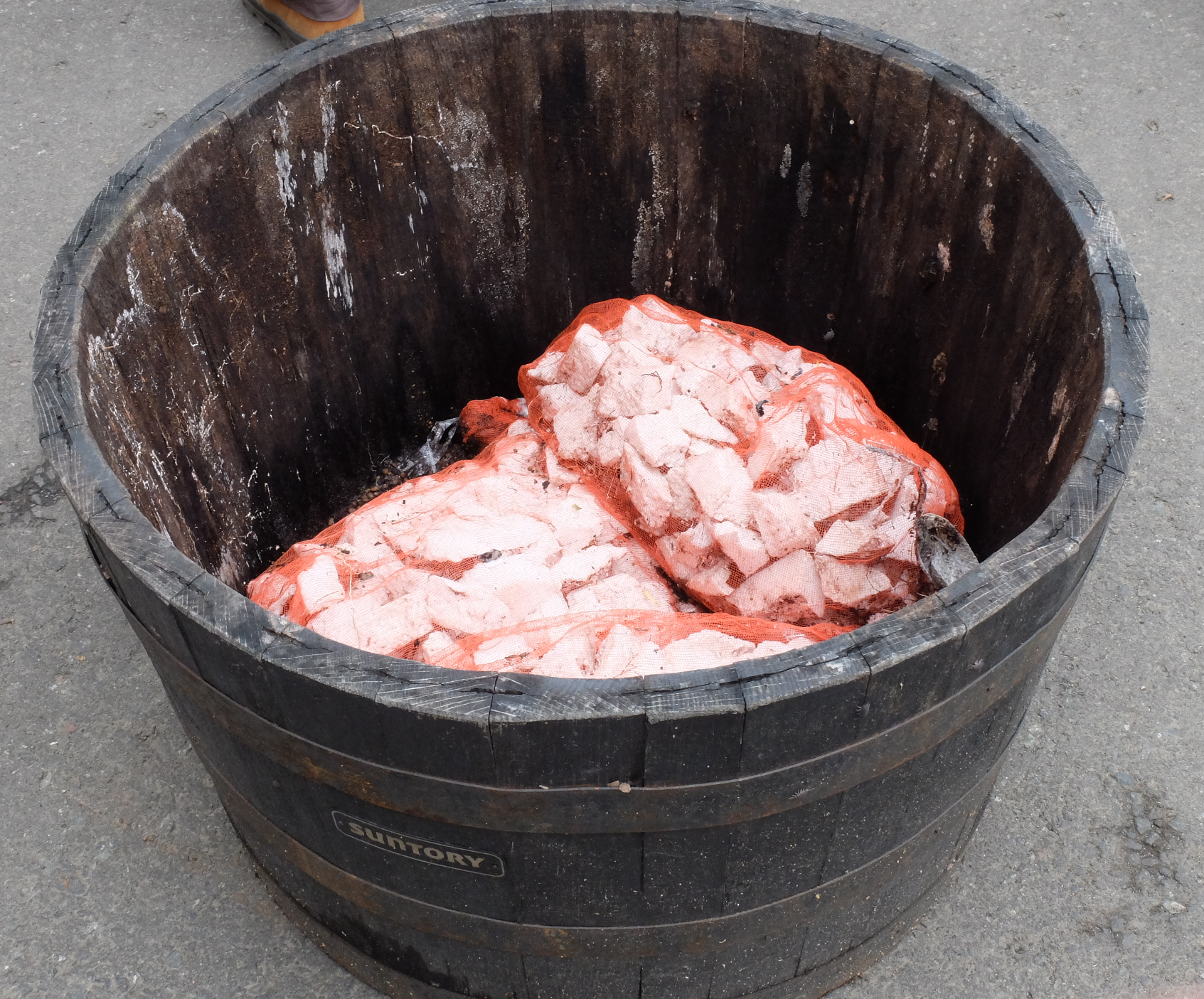 今回、使用したコンテナは大きなモルト樽のため、重量を押さえるために発砲スチロールをネットに入れたものを鉢底石の代わりに使用するテクニックも教えていただきました。