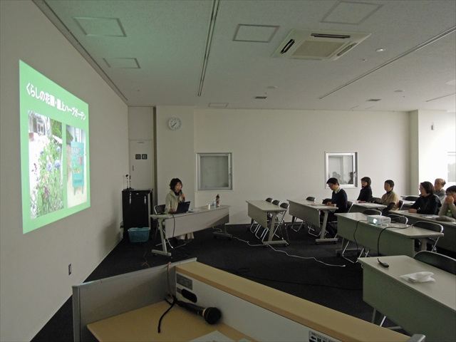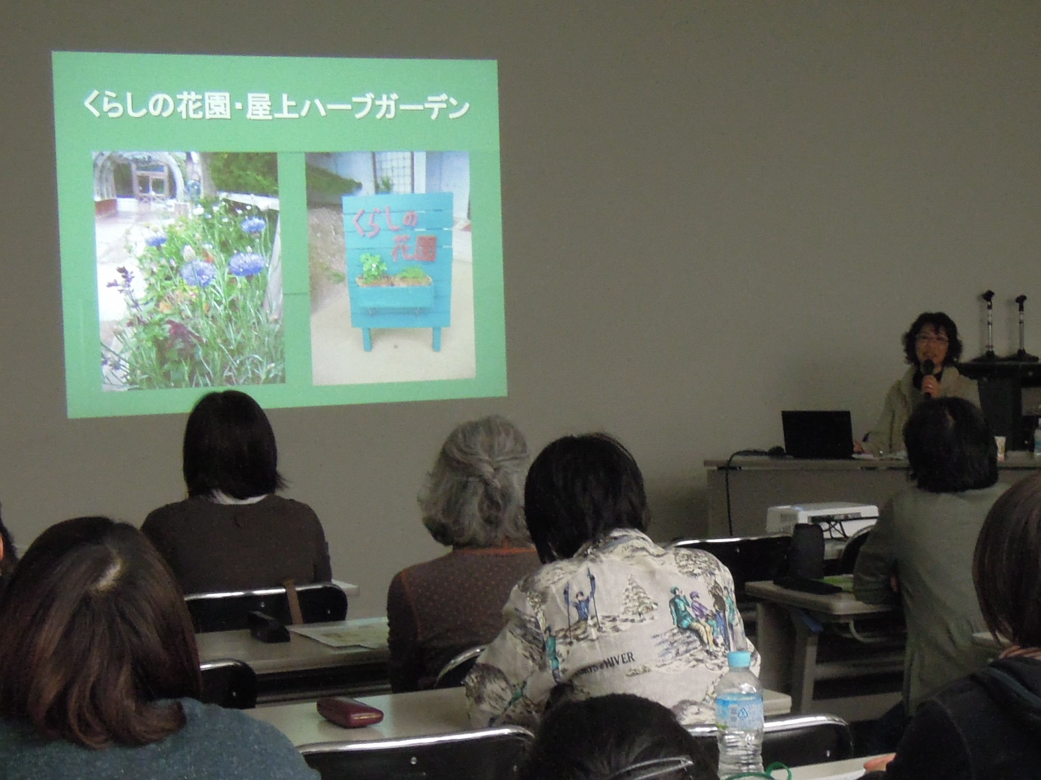 記念すべき第1回目の講師は、ハーブコーディネーターでありボランティア団体「グリーンエプロンズ」代表の 狩野亜砂乃さんでした。初回テーマにふさわしく「ガーデニングボランティア」について講義をしていただきました。