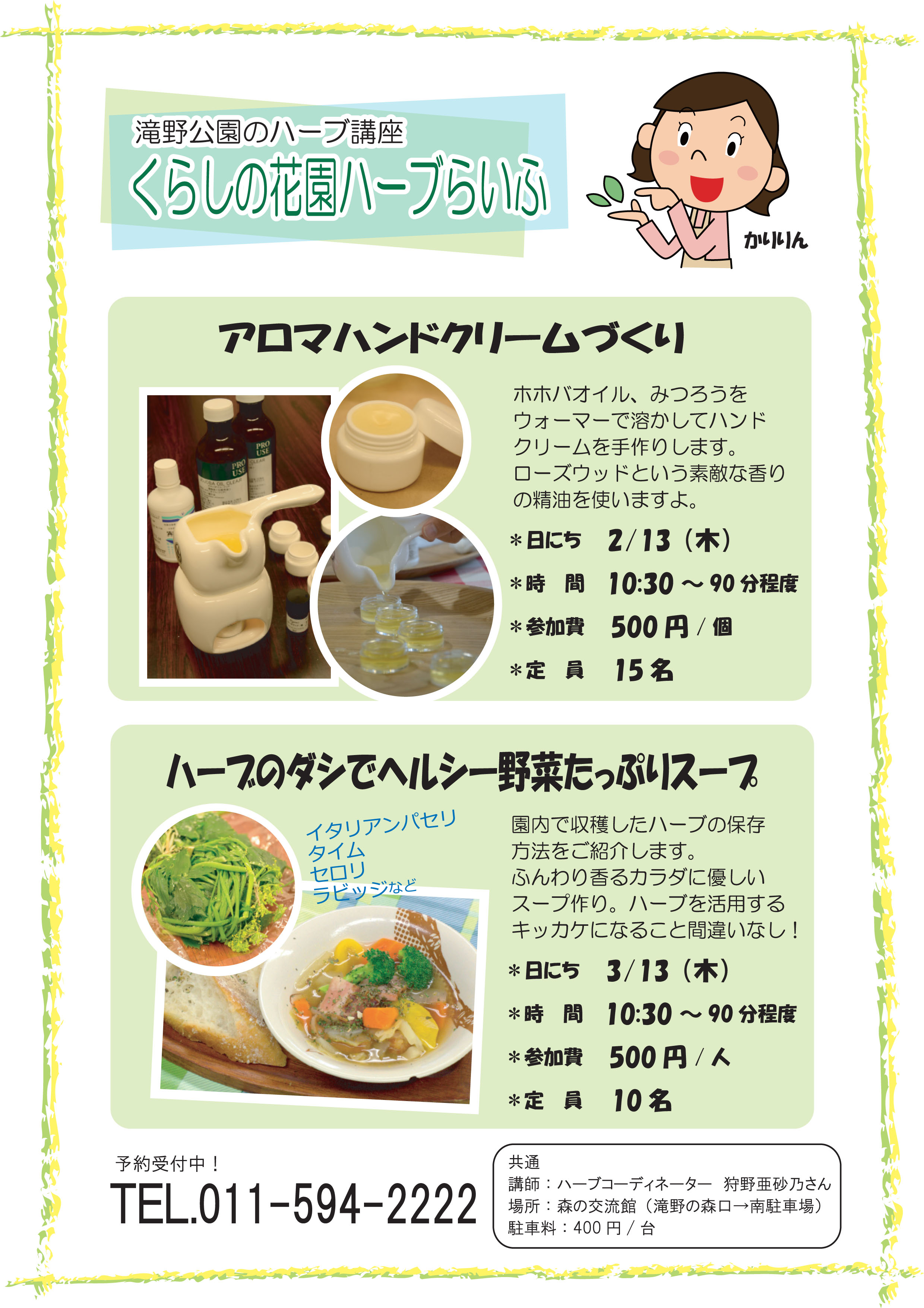 滝野丘陵すずらん公園にある「くらしの花園」は30周年を記念して、かりのさんに監修いただいたハーブガーデンです。こちらではガーデンで獲れたハーブを使ったさまざまな講座「くらしの花園ハーブらいふ」が行われていますので、興味のある方は是非参加してみてください^^