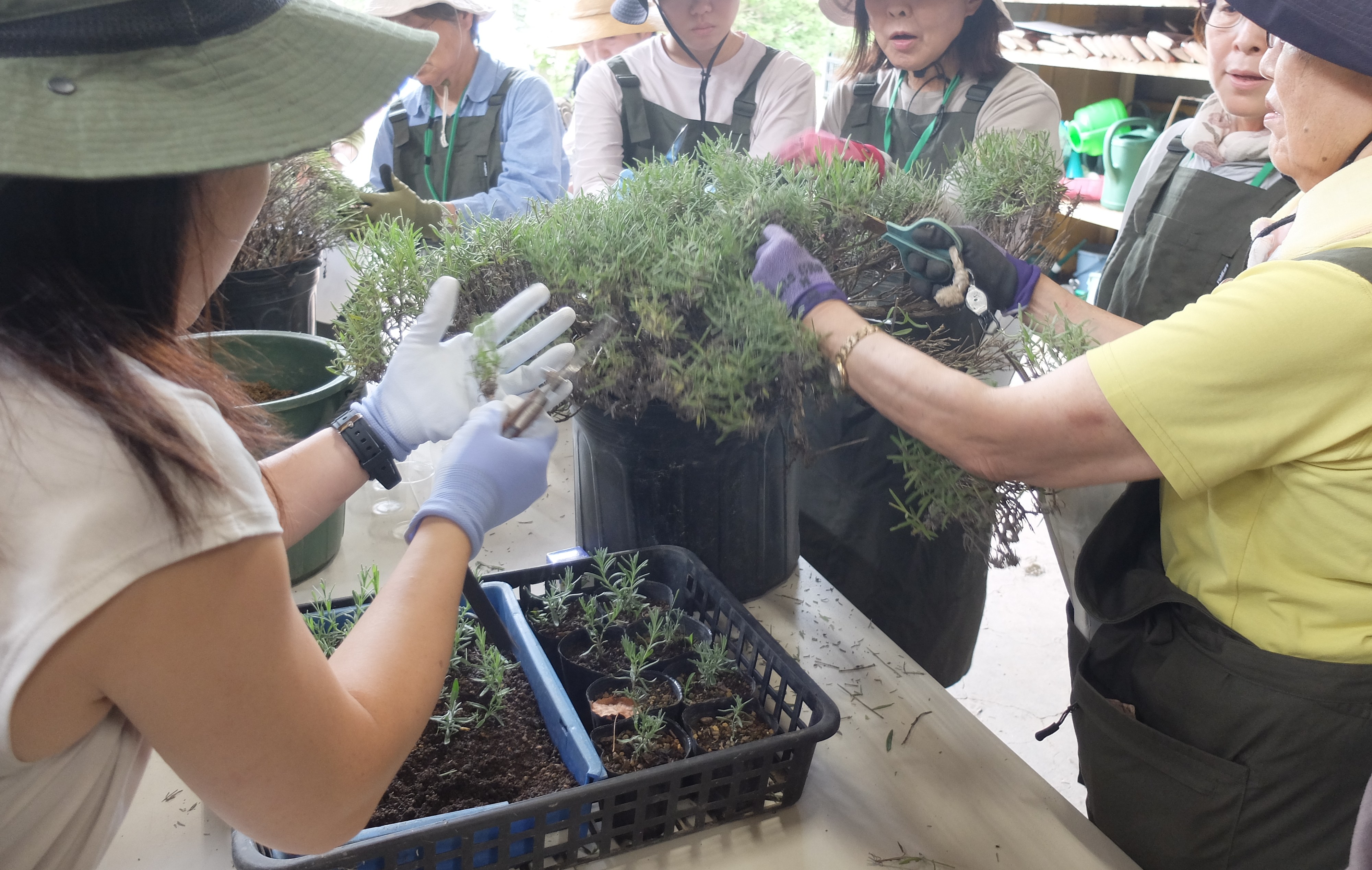 はじめに、講義でラベンダーの特徴や剪定を行う理由、剪定に適した時期、剪定箇所について説明があり、ふやす方法の1つである「挿し木」について必要な道具や手順、挿し穂の採取方法などを学びます。