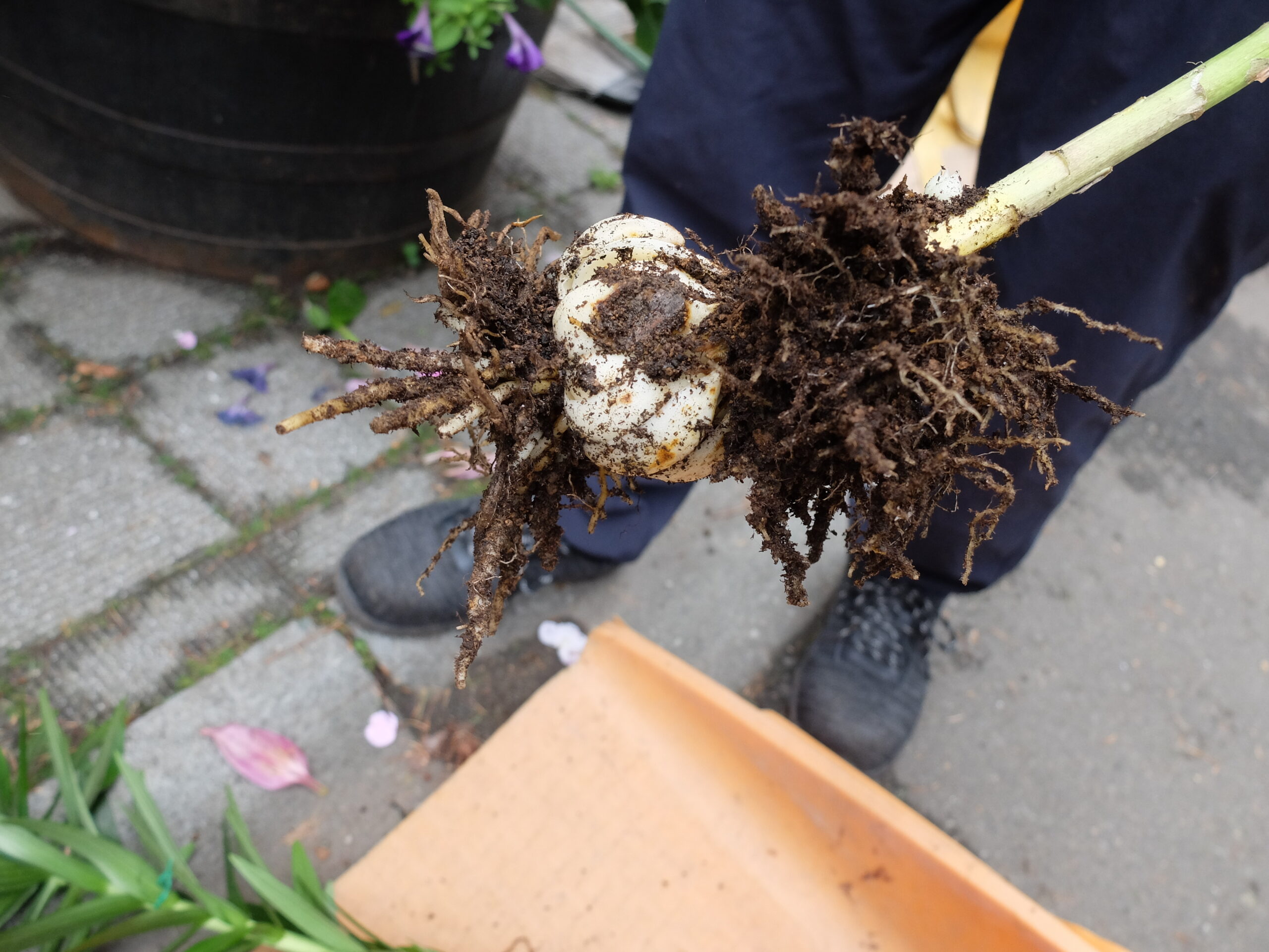 掘り起こしたユリの根を観察すると、球根の上に生える上根(うわね)と下に生える下根(したね)があると講師から説明があり、「初めて見る」ユリの球根の形状に驚かれている方もいました。