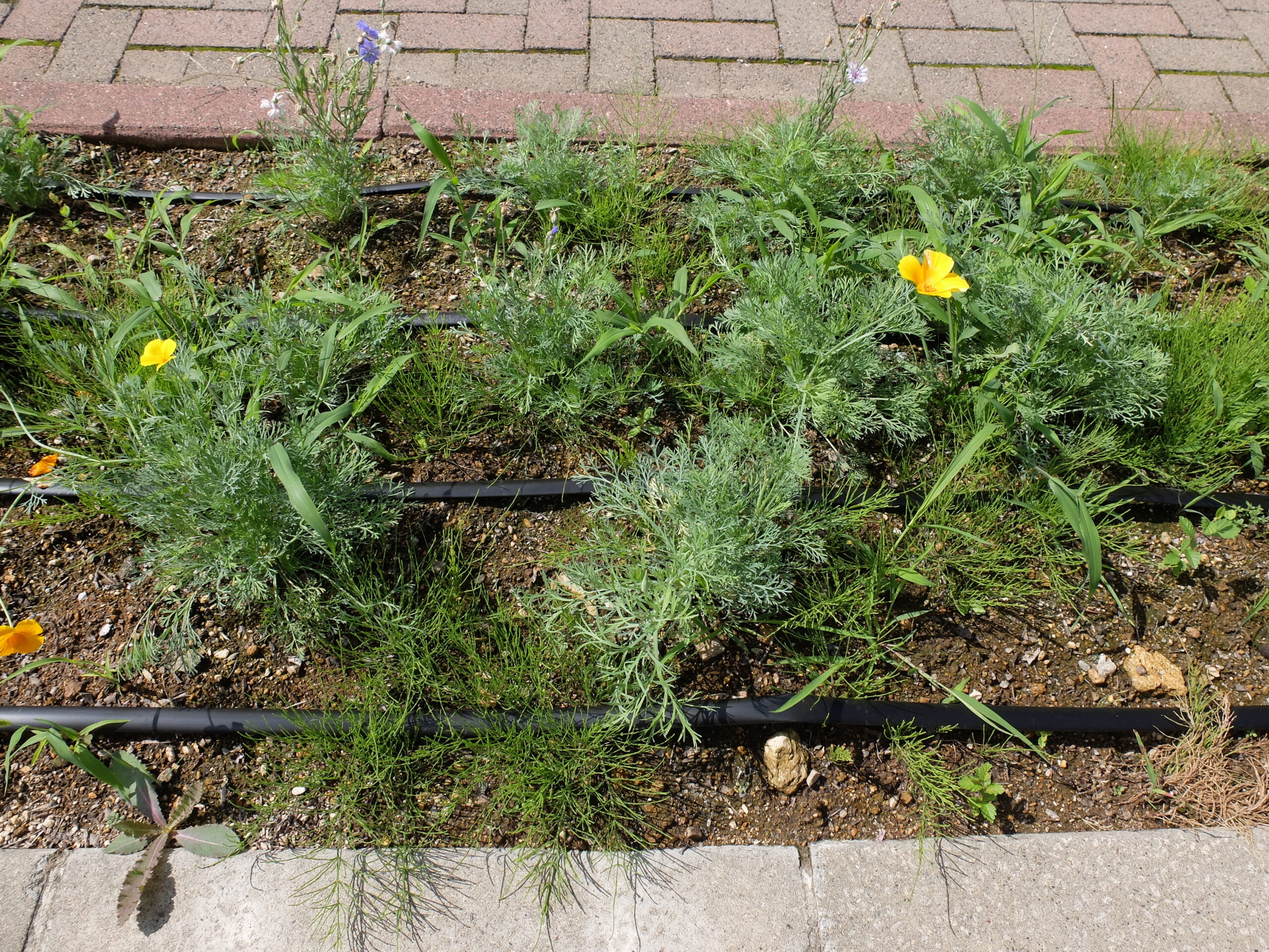 まずは講師より6月22日にたねダンゴの植え付けを行ってから、7月上旬に発芽し、その後適度に降雨があったおかげでたねダンゴの植物が開花したこと、一緒に雑草の勢いも著しかったため協会スタッフによって除草を行ったこと、水枯れ対策のため潅水装置が設置されたこと等、今までの花壇の経過についてが説明がありました。