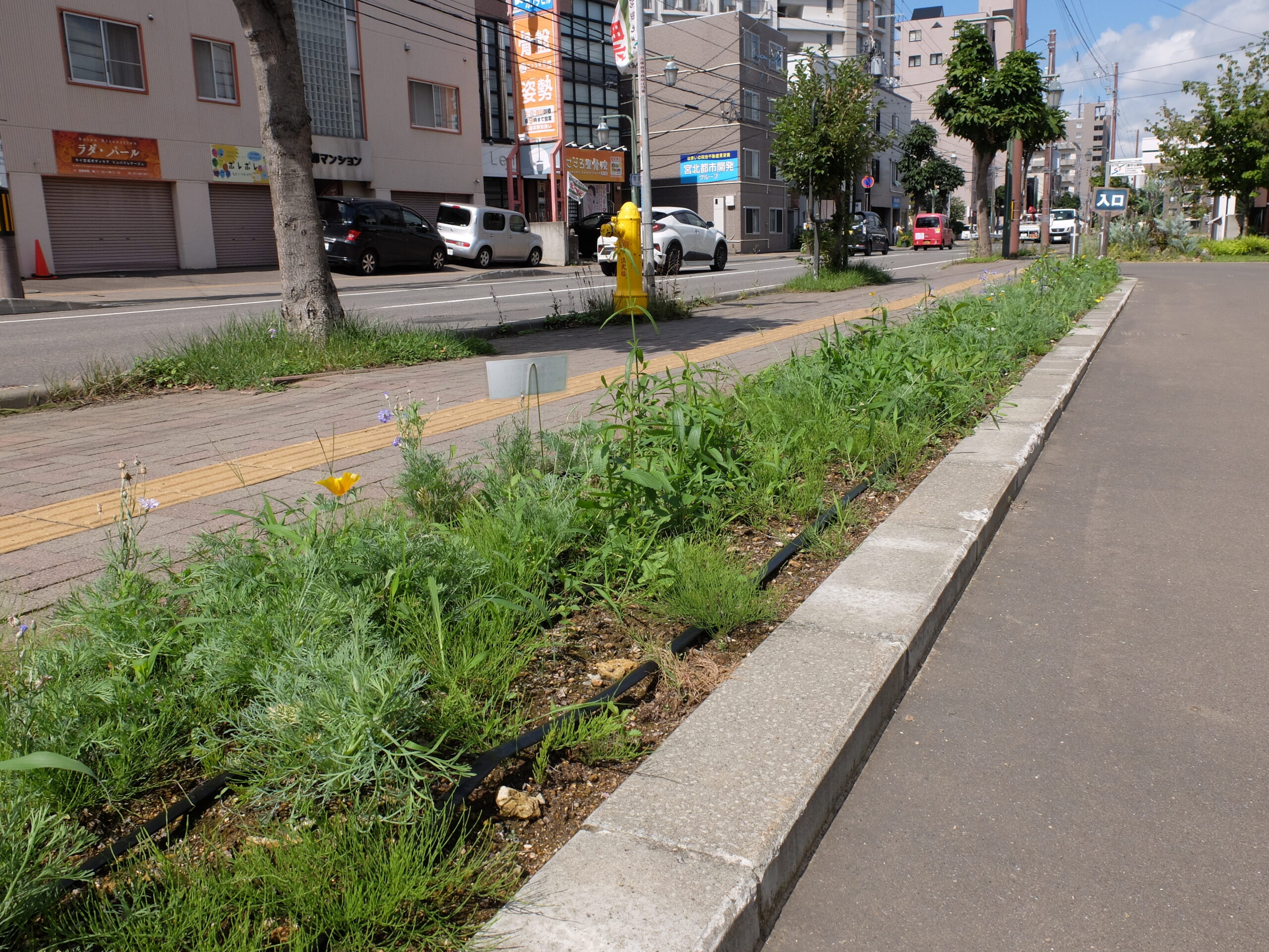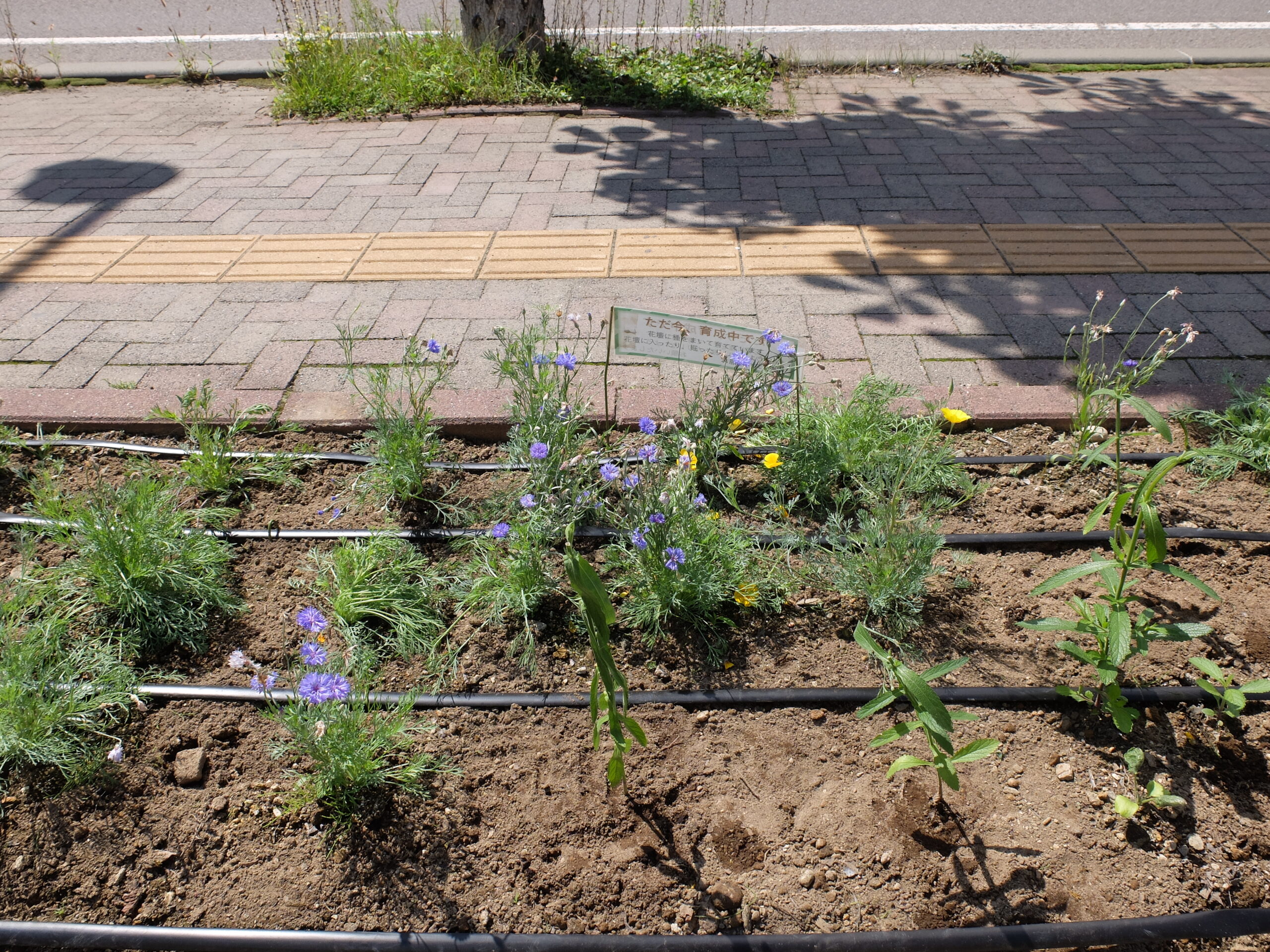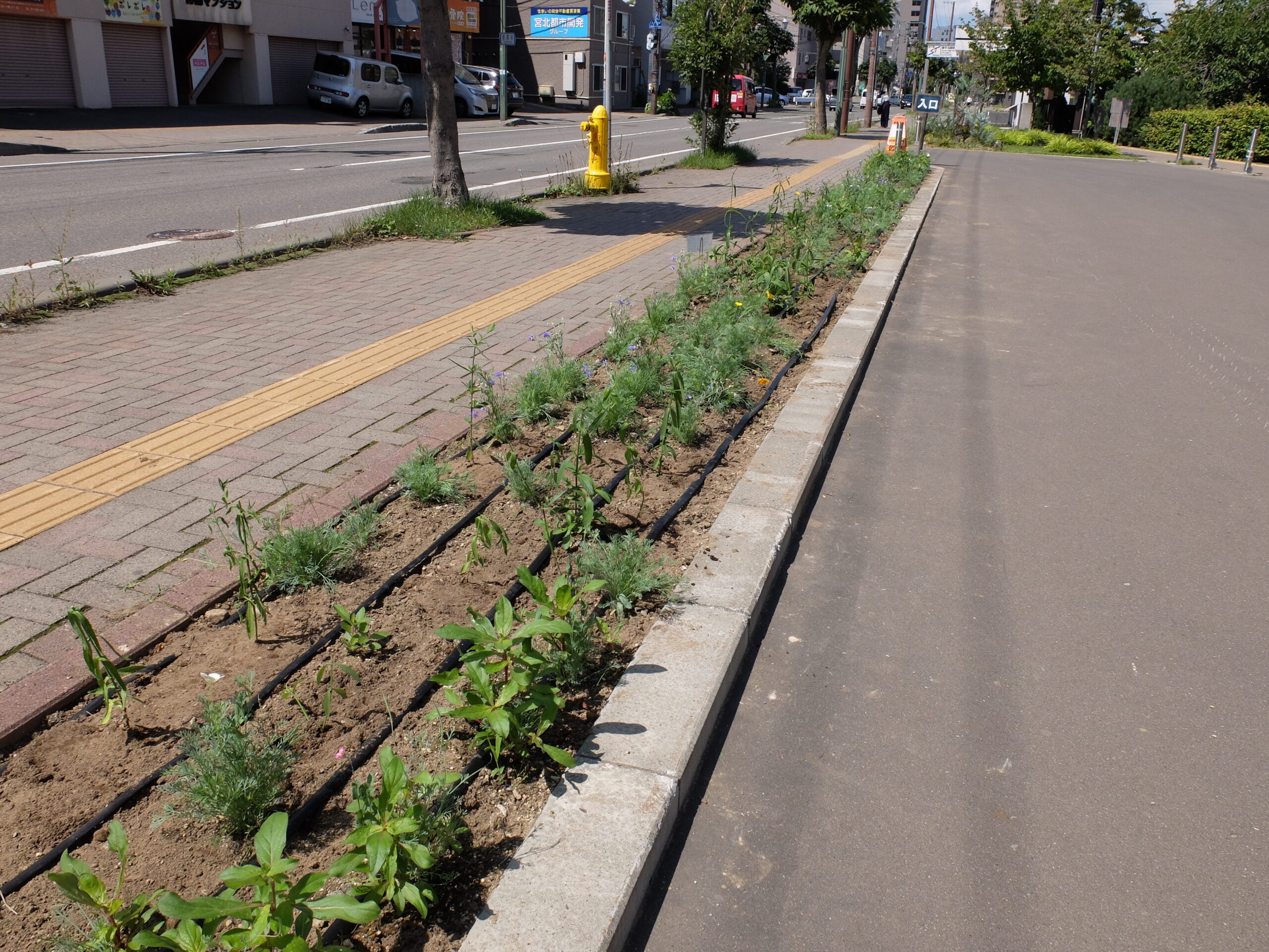 たねダンゴの花壇は、地下鉄東豊線豊平公園駅1番出口からすぐの豊平公園緑のセンターの正面の歩道沿いに作られています。付近には中学校や警察署があり、多くの方が往来する歩道沿いに花壇がありますので、開花が進むにつれ、たくさんの人の目を楽しませてくれそうです。