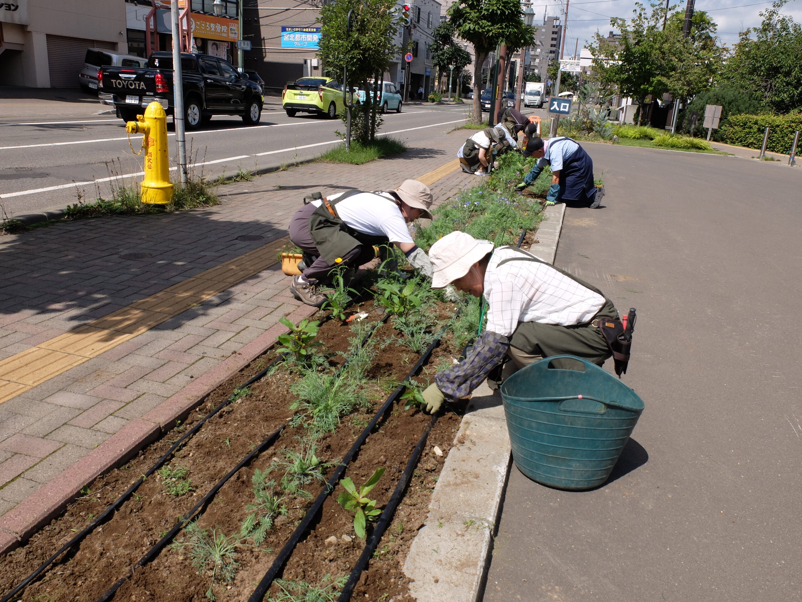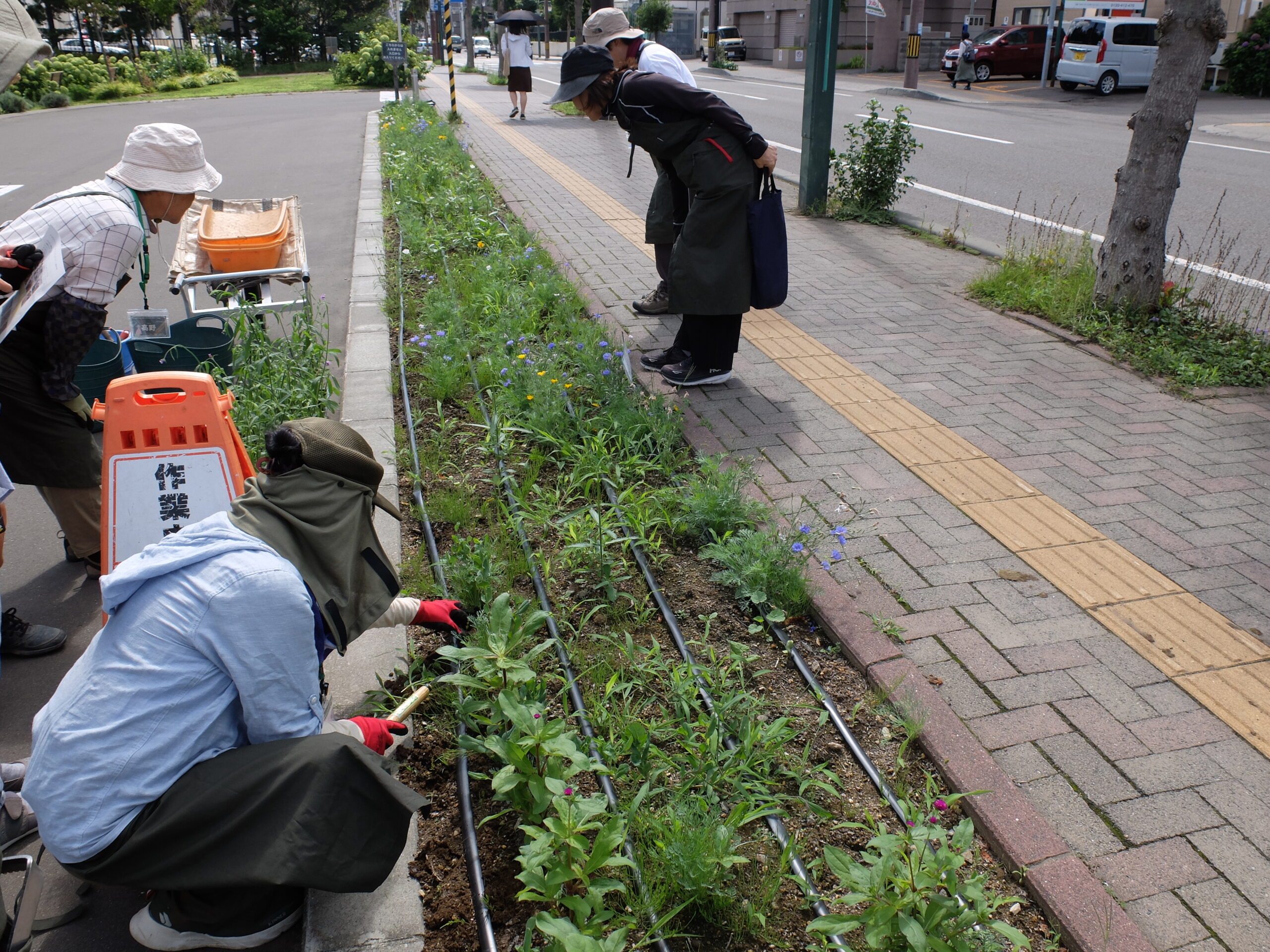 2024年8月21日水曜日、令和6年さっぽろまちづくりガーデニング講座の課外活動「たねダンゴの花壇づくり」のメンテナンス活動を豊平公園で行いました。今回は受講者5名とタネだんごサポーター2名が集まり、メンテナンスの指導を実習で講師を務めた当協会職員でさっぽろ花と緑のネットワーク事務局を運営している齋藤聡子が行いました。