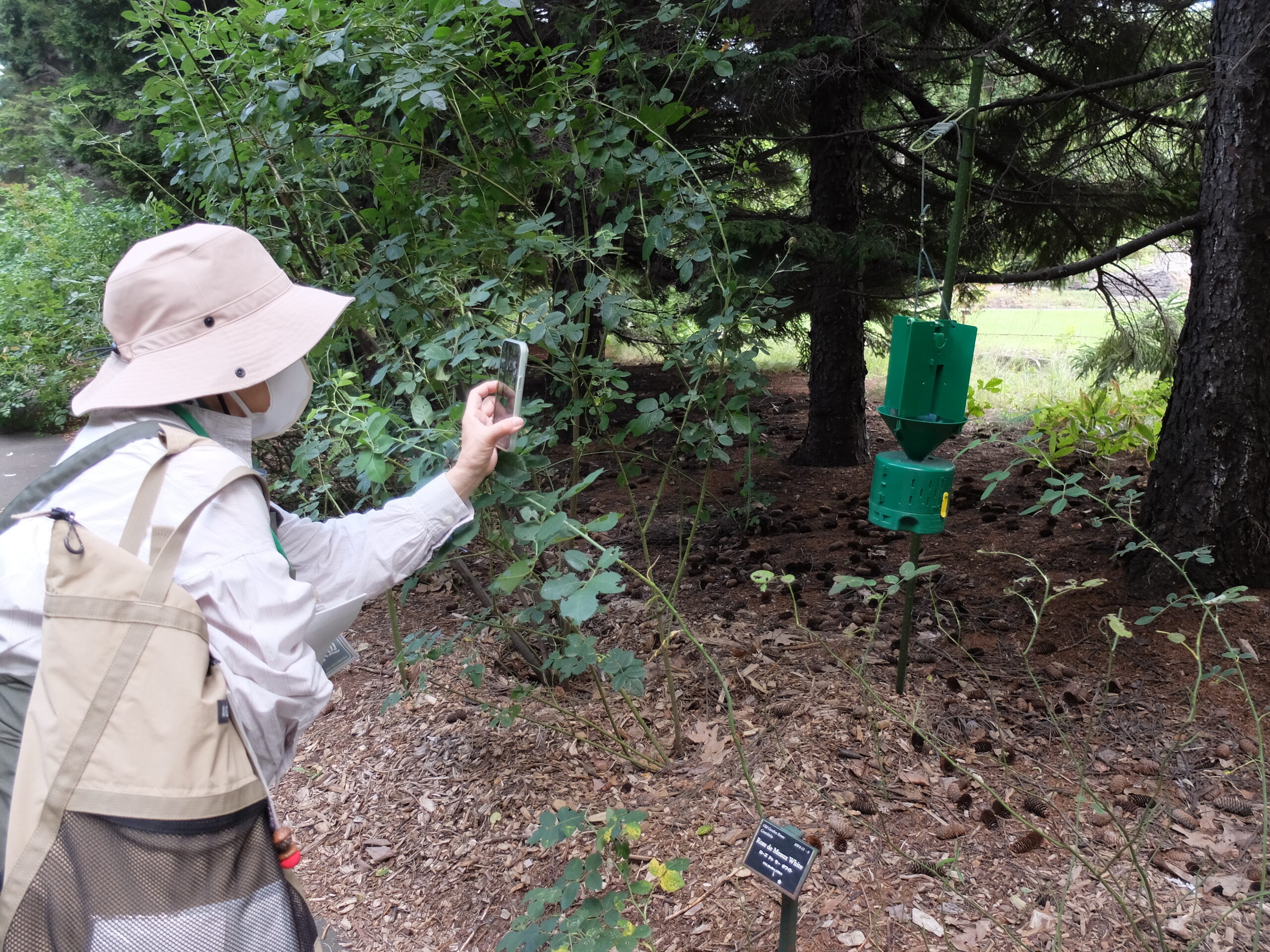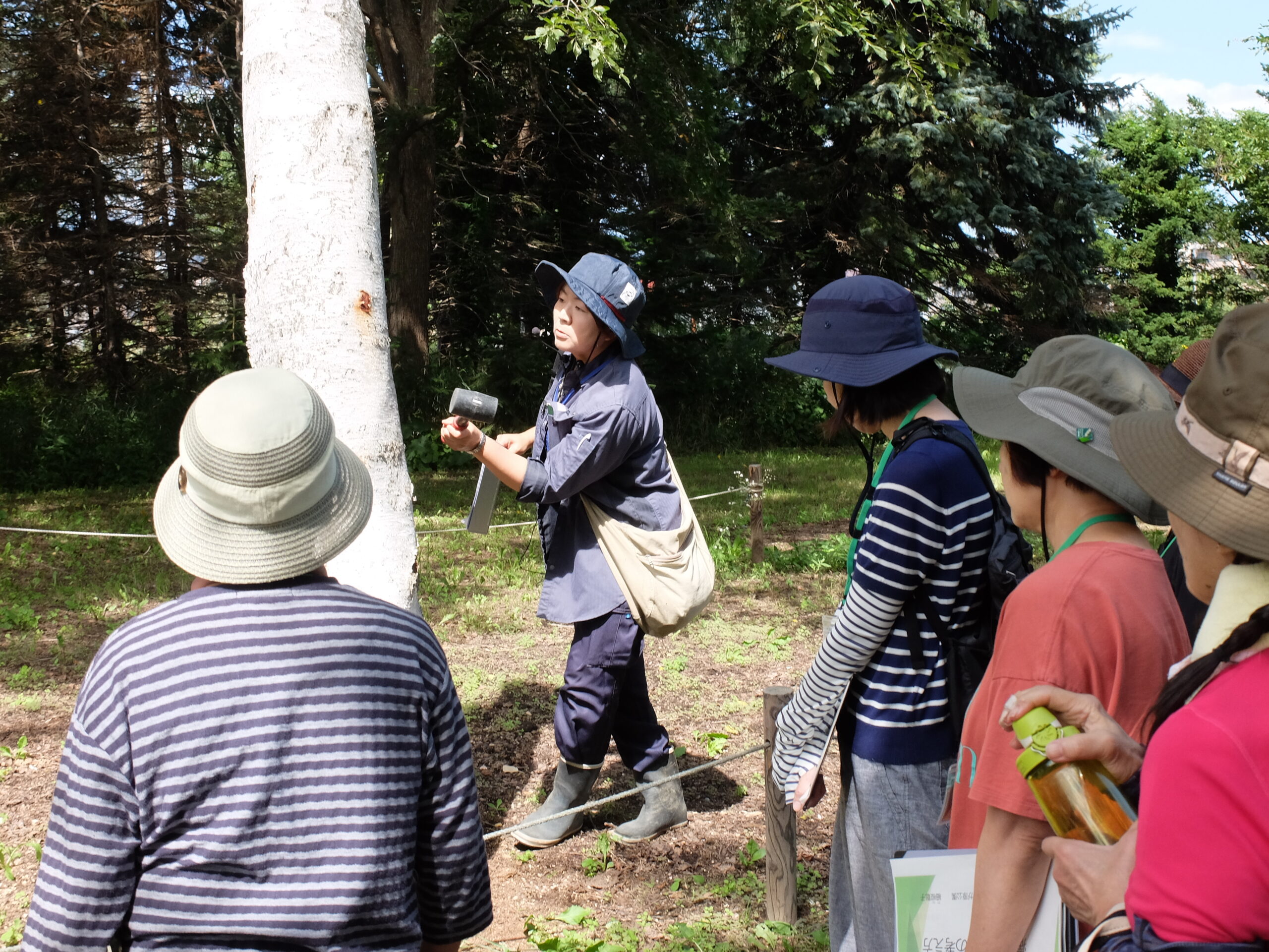 初めに講義で、病害・虫害が発生する理由、病害虫の種類や被害の特徴、植物を病虫害から守るには日頃の観察で早期発見・早期対処することが大切なこと等を学んだ後、屋外に場所を移して、実際の病害虫の被害や百合が原公園で行っている防除対策を見学しました。