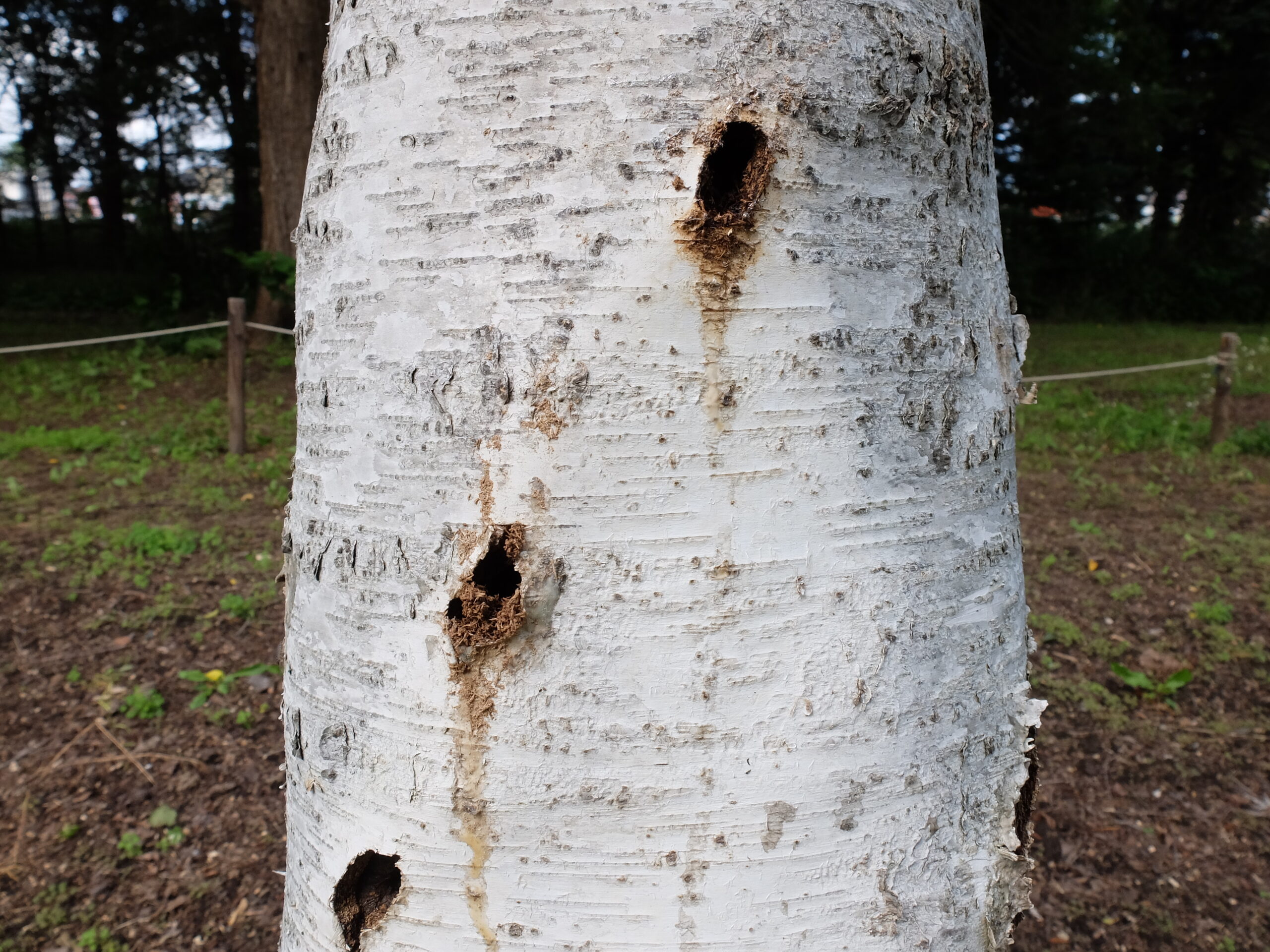 こちらの白樺の幹には穴がいくつも開いていて、よく見てみると穴からは木くずが出ています。