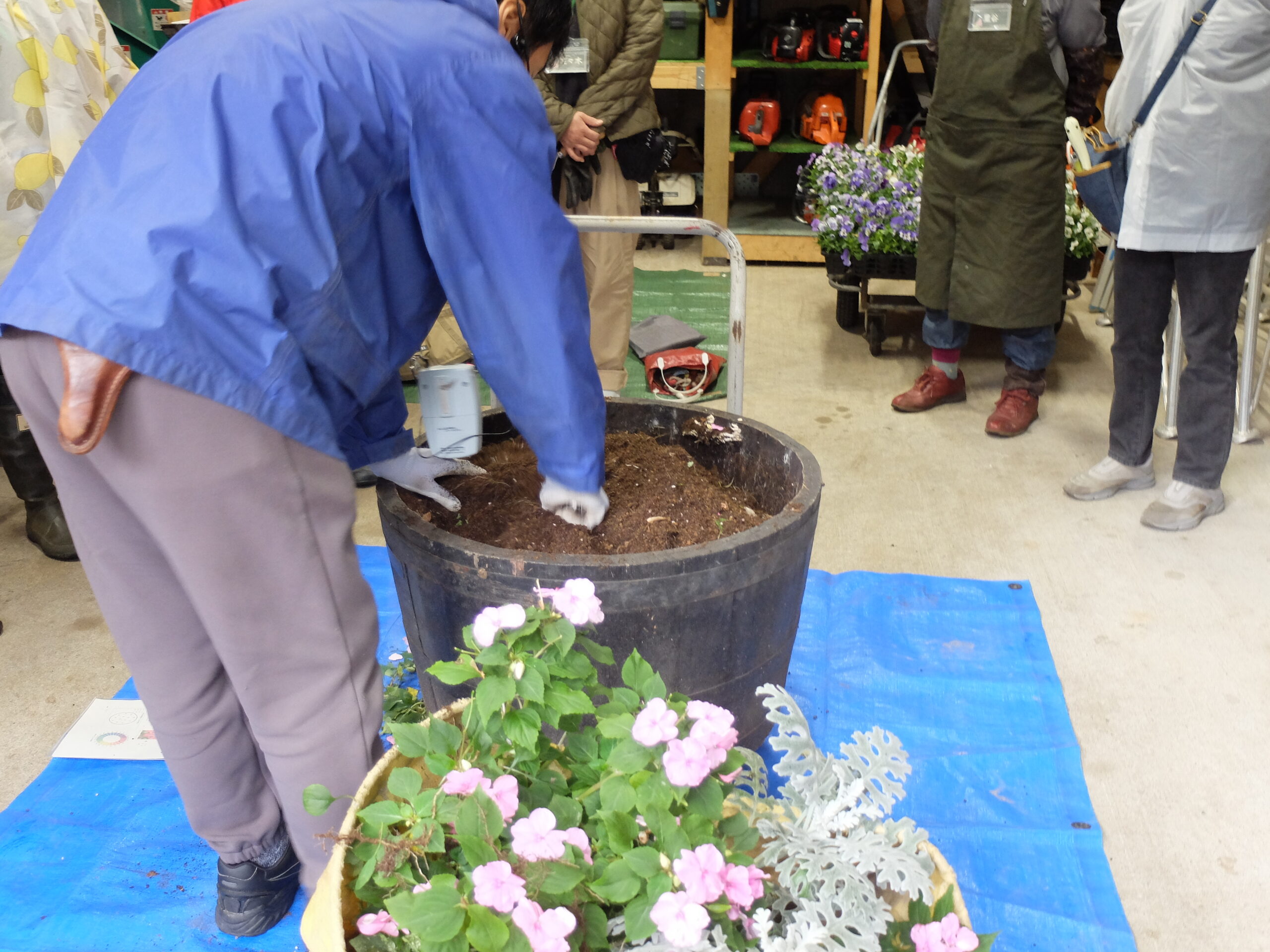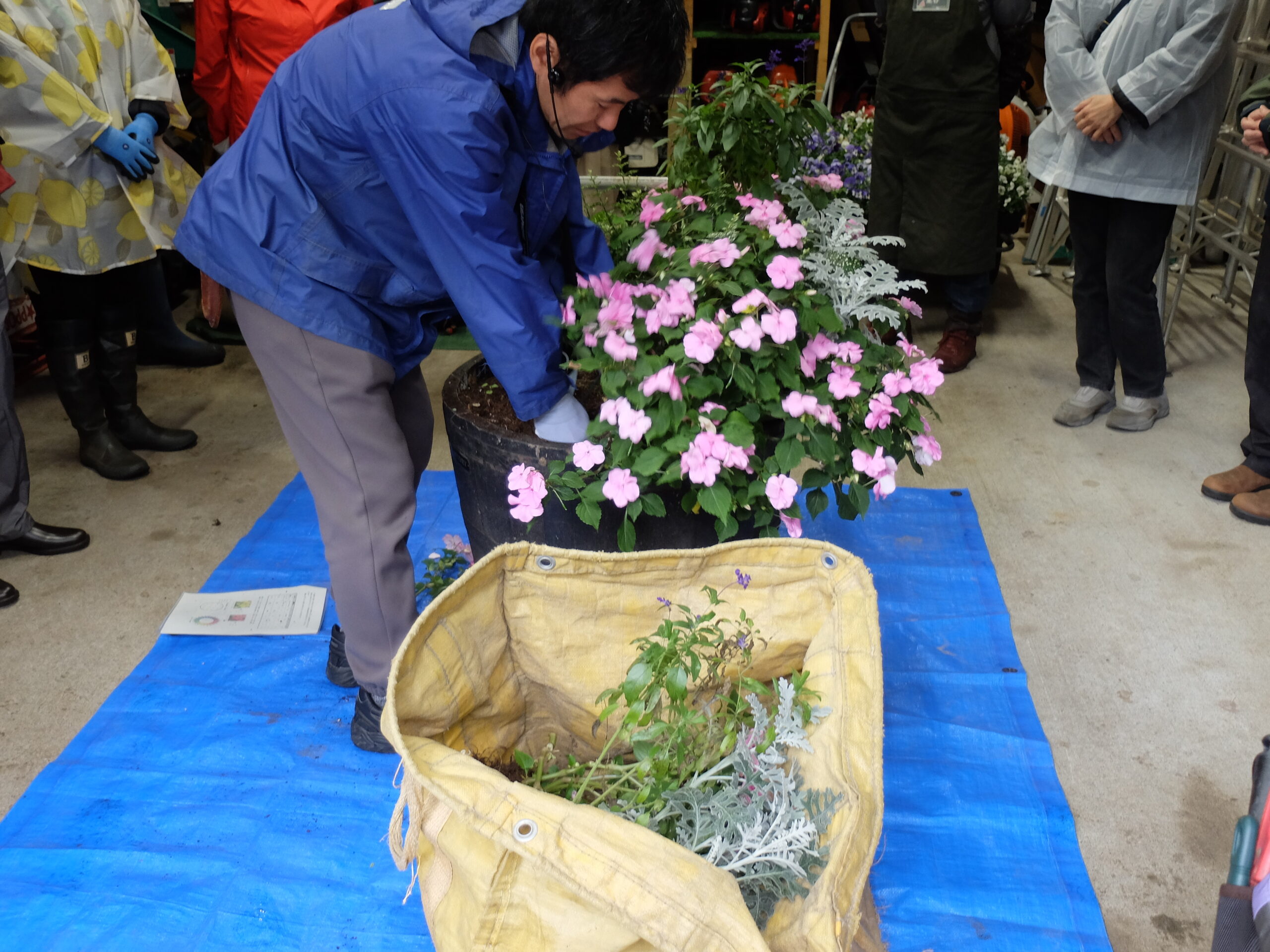 続いて、講師によるデモンストレーションです。パークセンター前に設置されているコンテナを見てみると、まだきれいな花を咲かせていて、