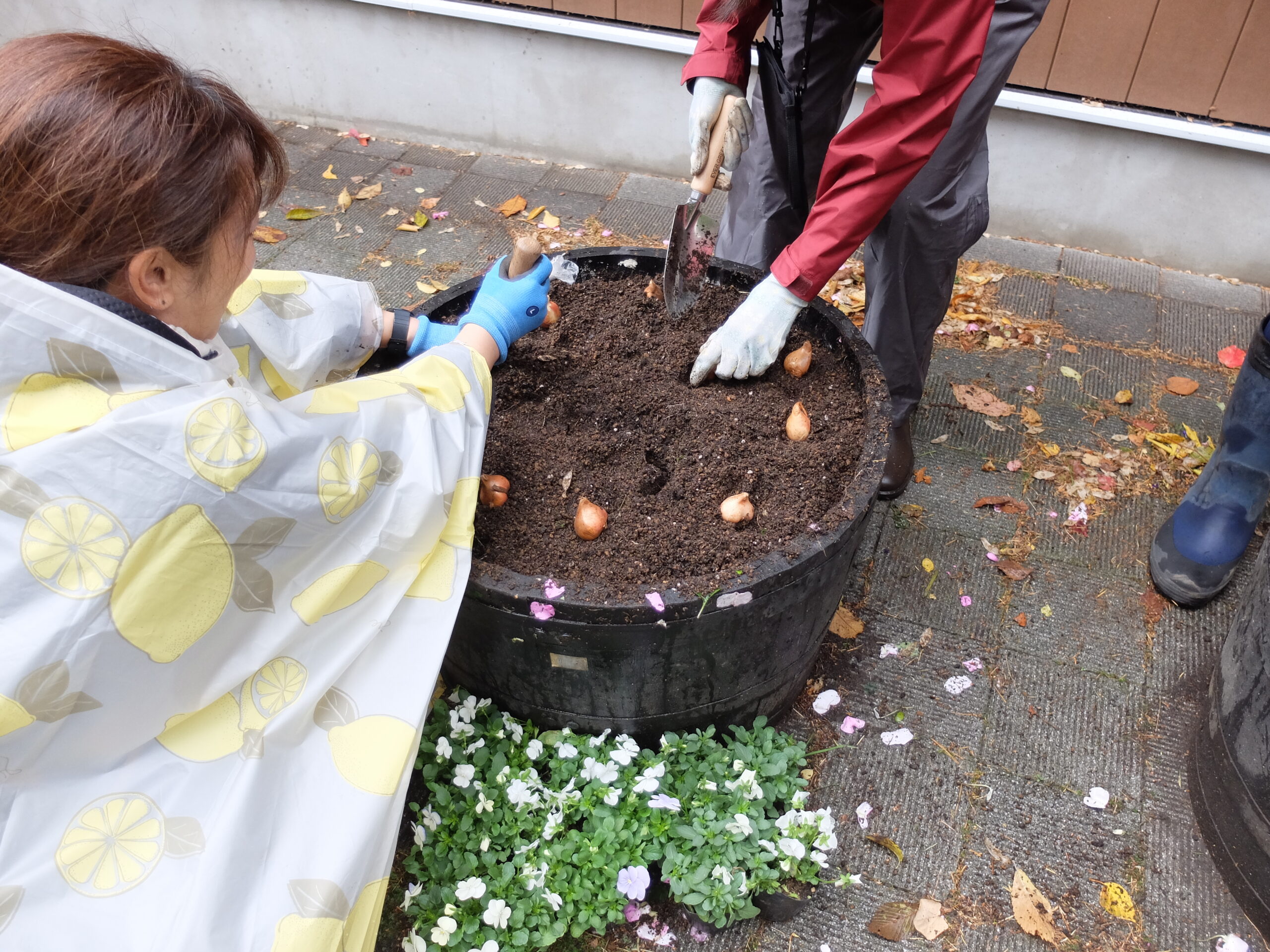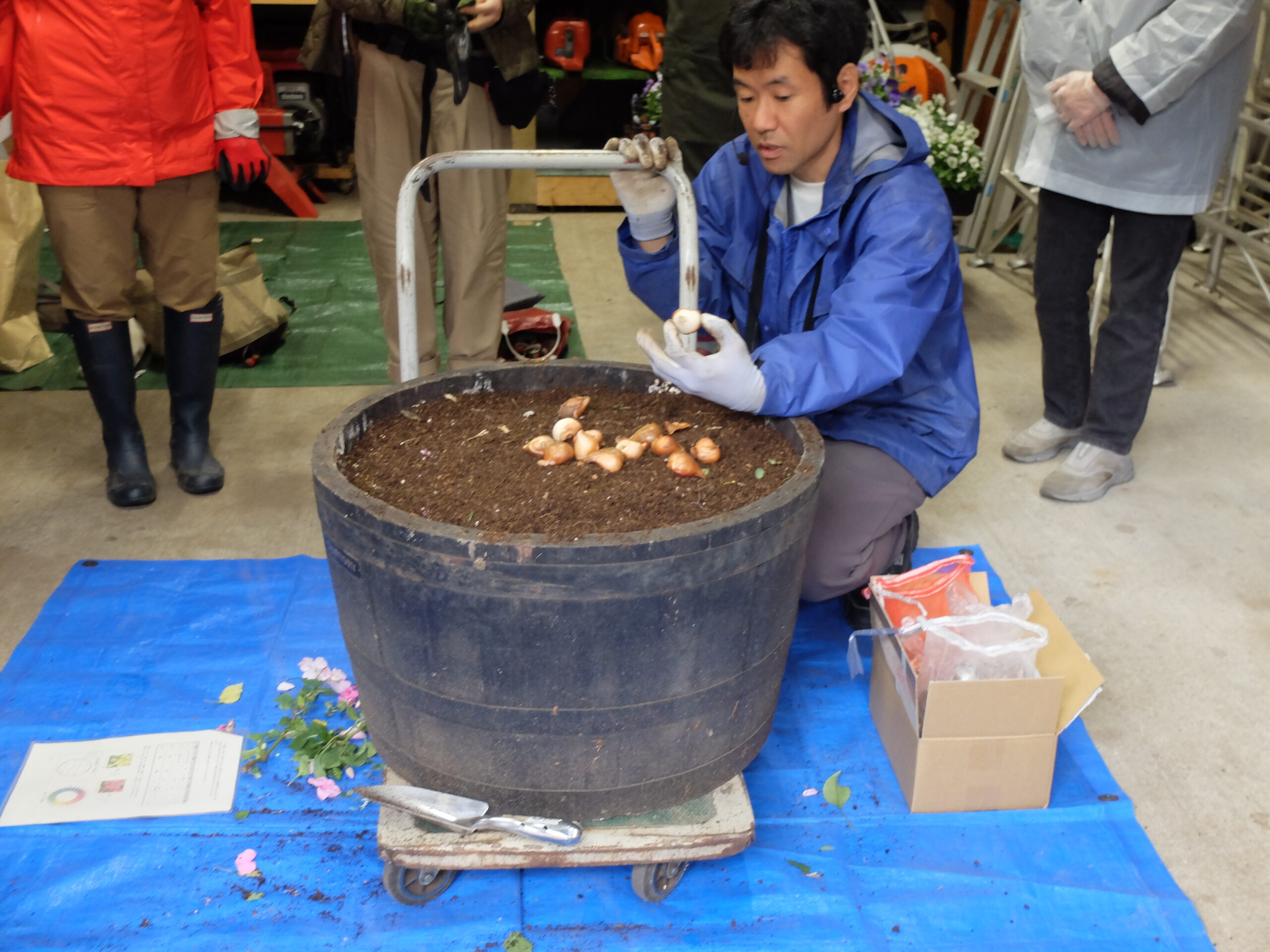 講師よりチューリップの球根を植える時には向きが大切との説明がありました。平らな面と丸みのある面があり、球根は葉が出る向きが決まっているので、それを揃えることで春になって、きれいに並んだ状態で生長するとのこと。