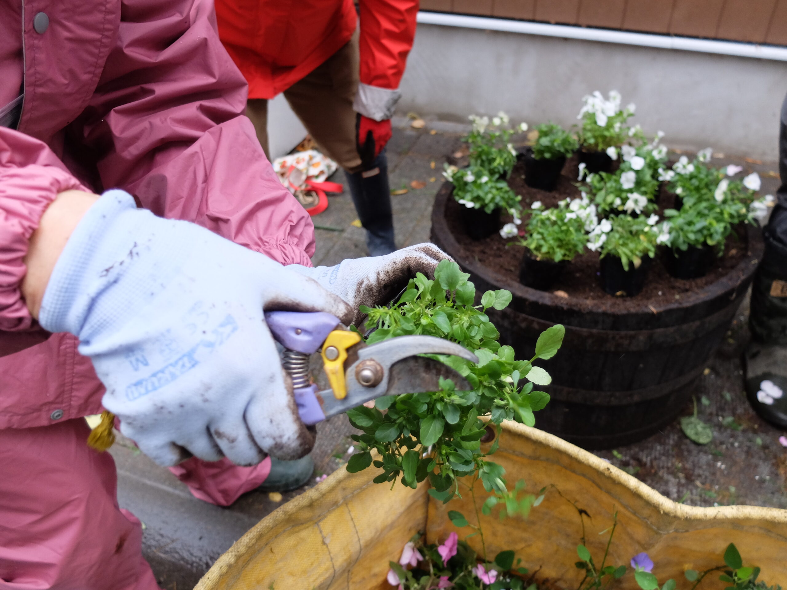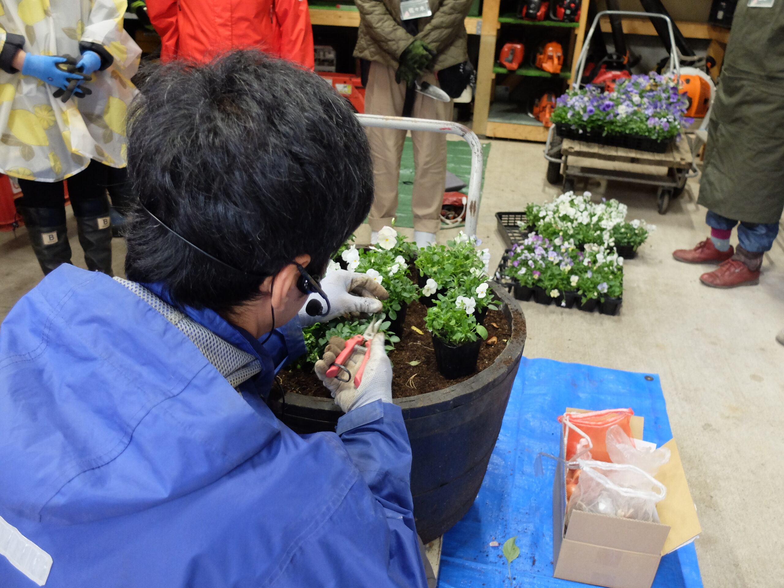パンジー・ビオラは植える前に花芽をはさみで摘んでから植えていきます。この時、下に植えたチューリップの球根を移植ごてで傷つけないよう丁寧に行いましょうと講師によるデモンストレーションの後、