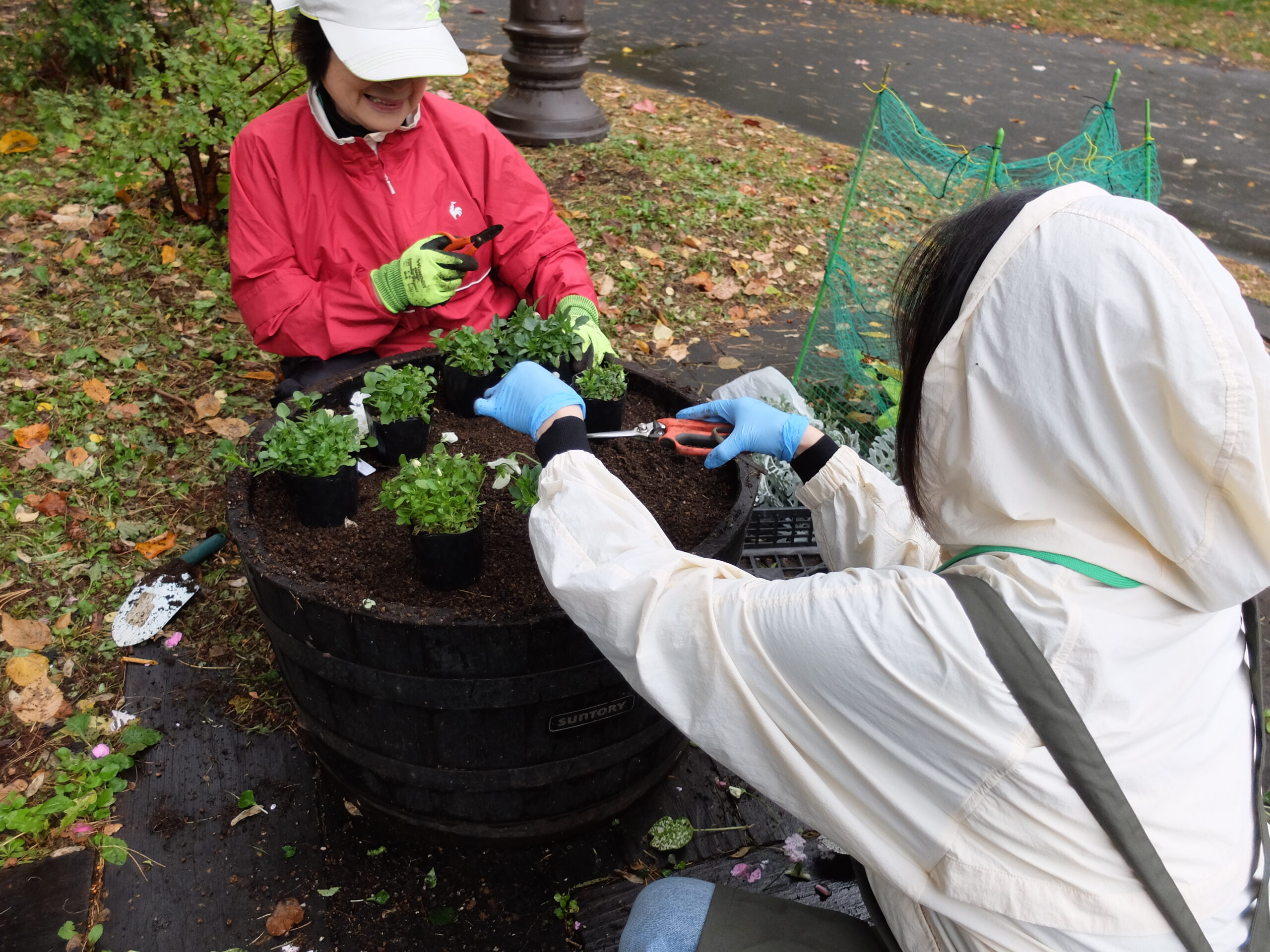 今回は、6月に受講者のみなさんが作成し、夏から秋にかけて円山公園を彩ったコンテナを来年の春に楽しめるチューリップとパンジー・ビオラを使ったコンテナガーデンに入れ替えていきます。