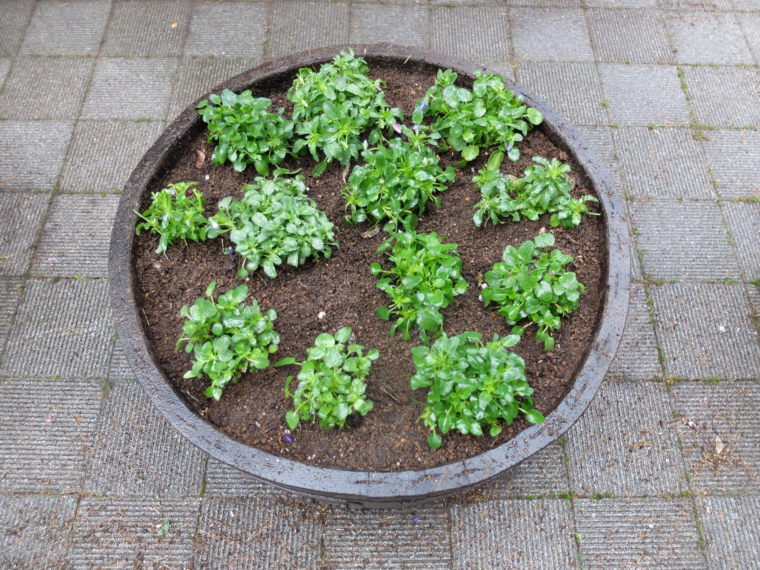 根の活着が良くなるようにビオラやパンジーの花も摘んでから植えていきます。