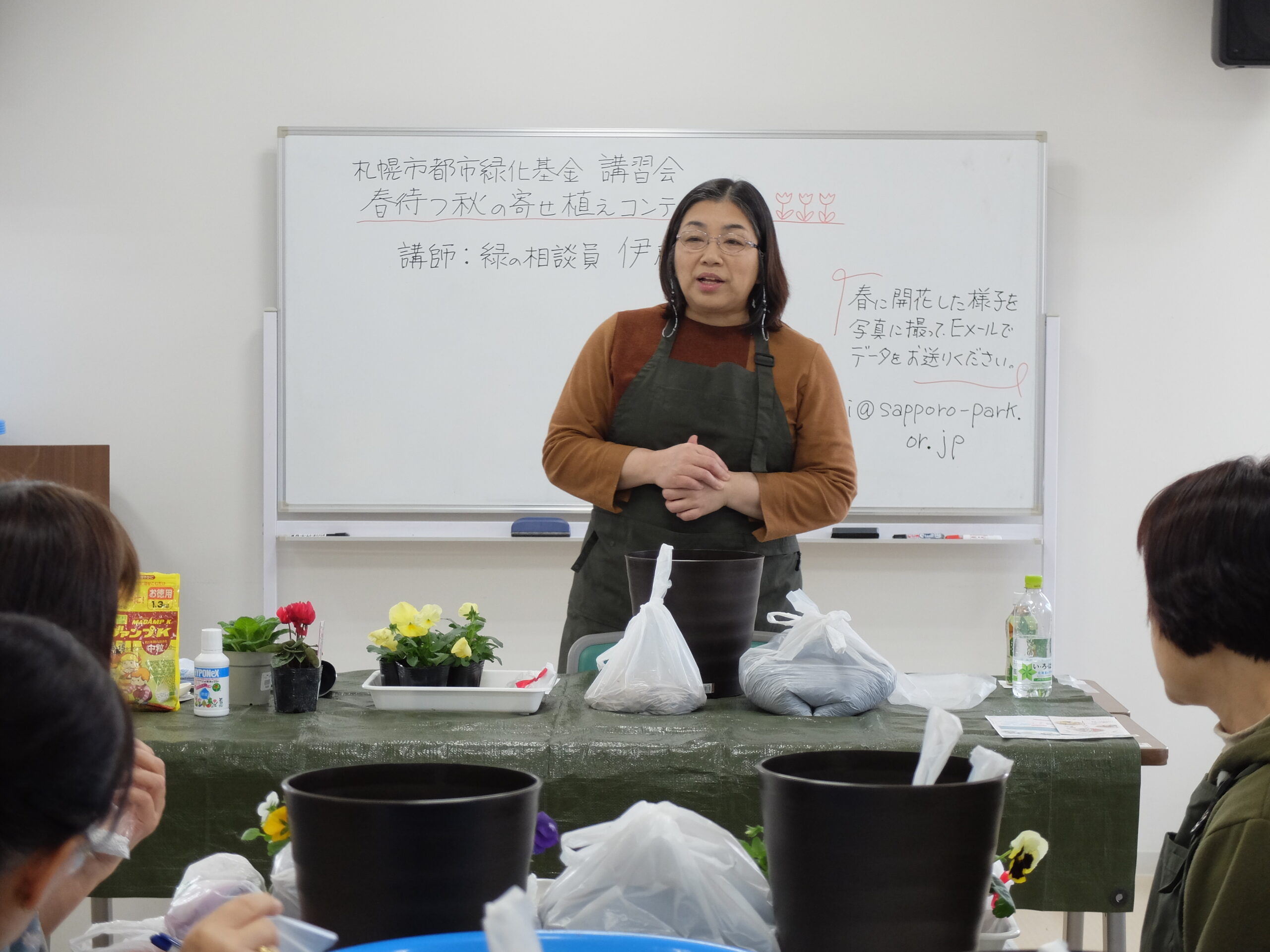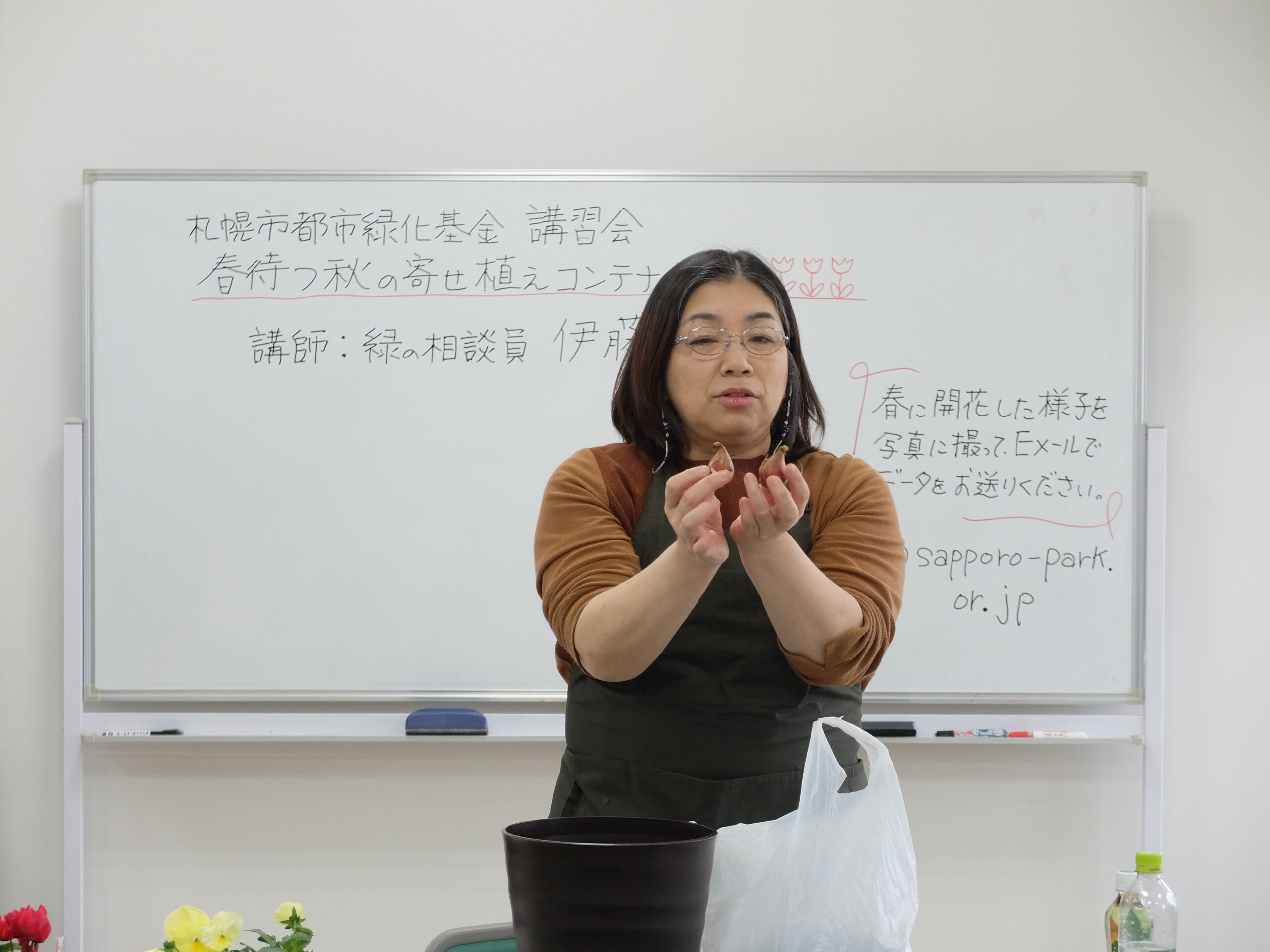 今回の講習会は、札幌を緑豊かな街にするため、自宅周辺など身近な場所で花や緑を育てるきっかけとなるよう、雪の下で越冬するパンジー・ビオラと雪解け後に開花するチューリップの球根を使ったコンテナを一人1個作りました。また、持ち帰ったコンテナの冬の間の管理方法や雪解け後の手入れについて学びました。