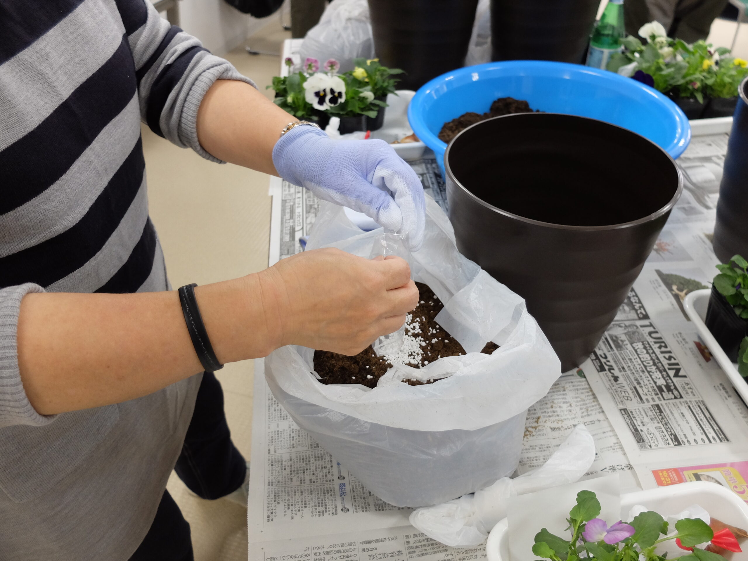 まずは、ゴロ土を入れ、肥料を混ぜた培養土をコンテナの中に入れていきます。