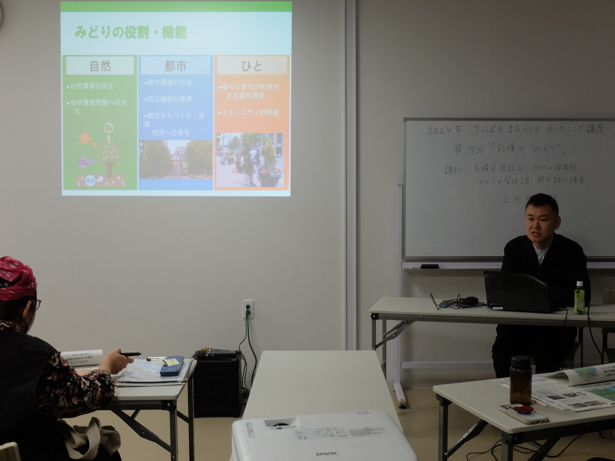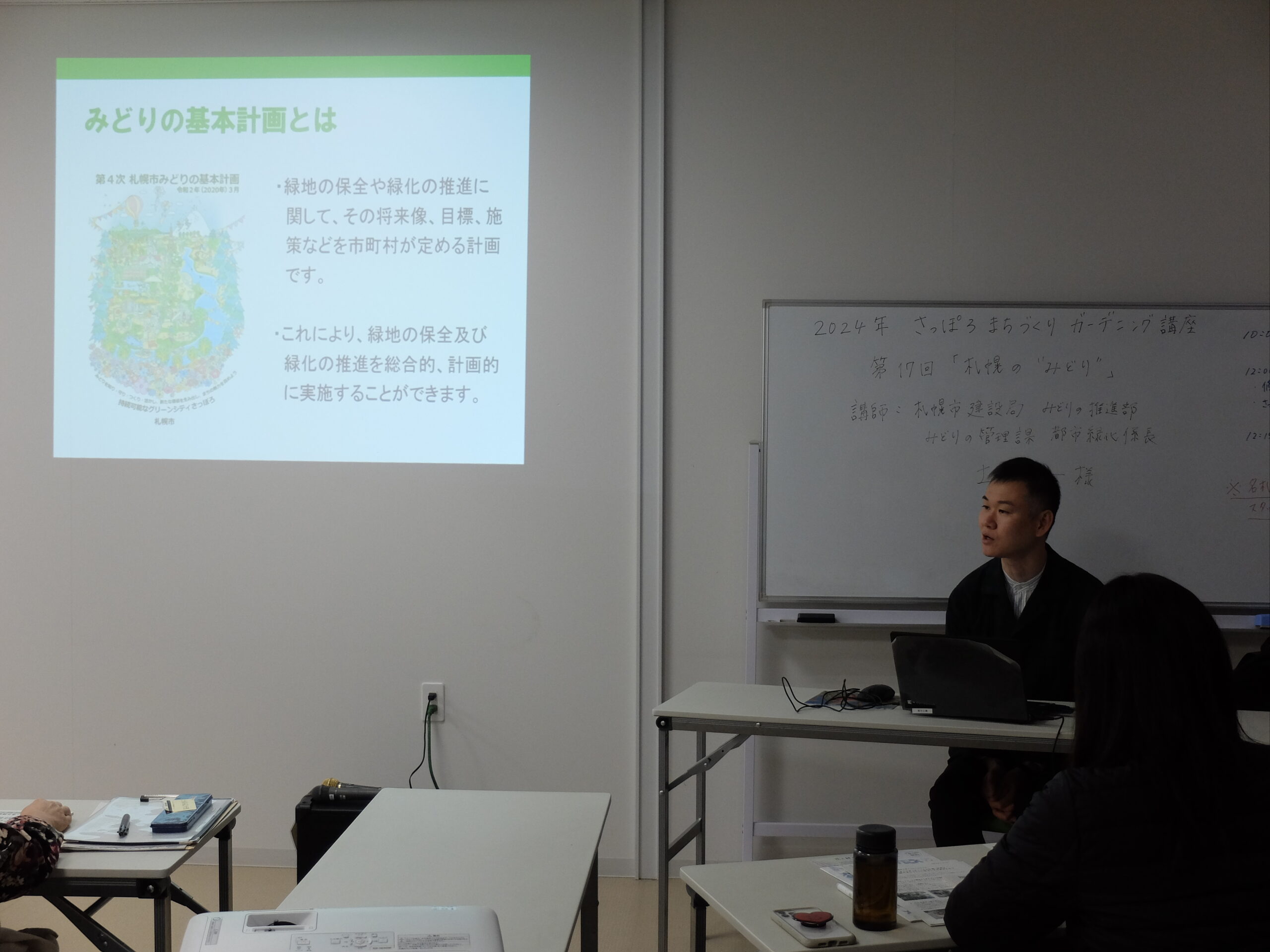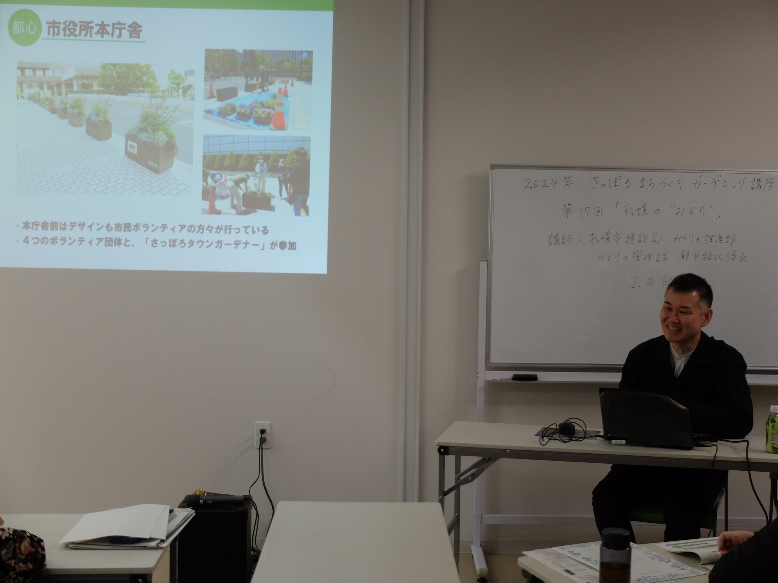 最終回のテーマは「札幌の‵みどり′」と題して、私たちが住む札幌市の緑の現状や花と緑のまちづくりのこれからについて学びます。講師は、札幌市建設局みどりの推進部 みどりの管理課都市緑化係長の土田健一様です。