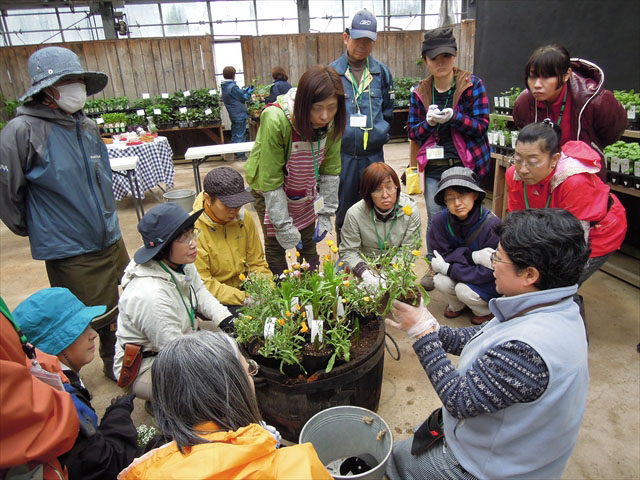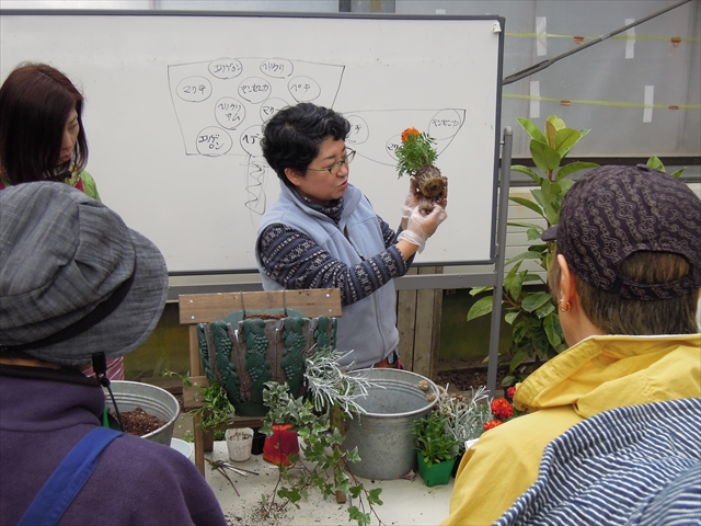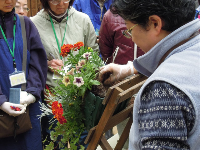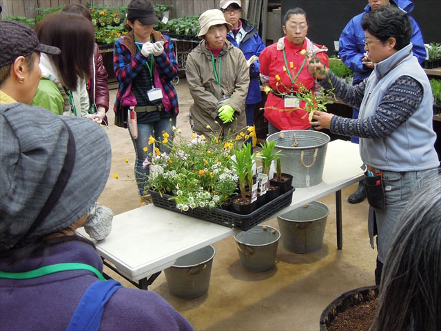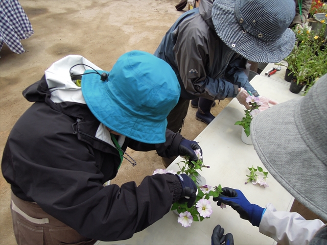 コンテナに植える前に、良い苗の選び方や切り戻しを教わってからみなさんにもカットしていただきました。