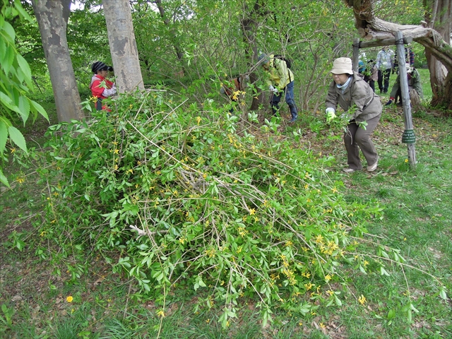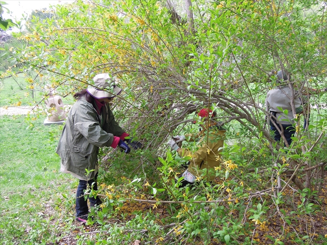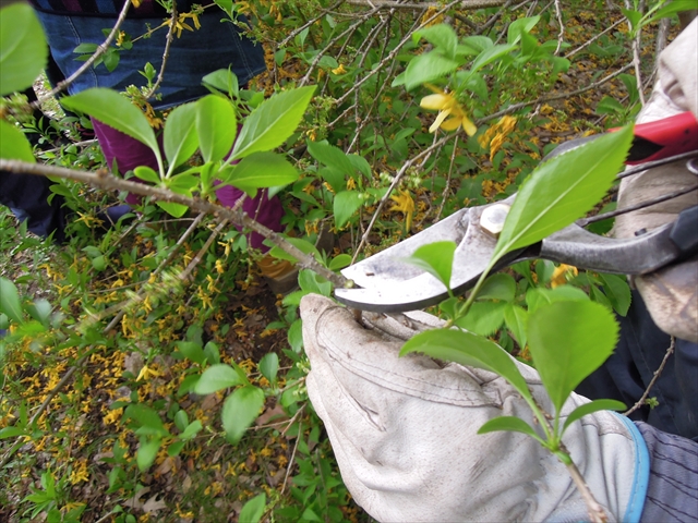 午前中はまず、<山内壮夫彫刻群>のそばにある、黄色い花のレンギョウの剪定から。