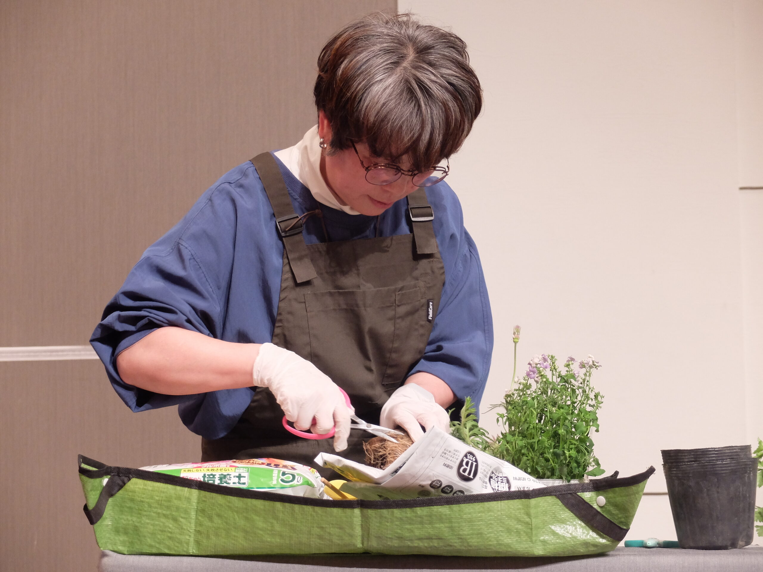 続いて、第二部では「寄せ植え公開レッスン」と題して、会場から抽選でおひとりにステージに上がっていただき、直接講師に指導してもらいながら寄せ植えづくりをしていただきました。