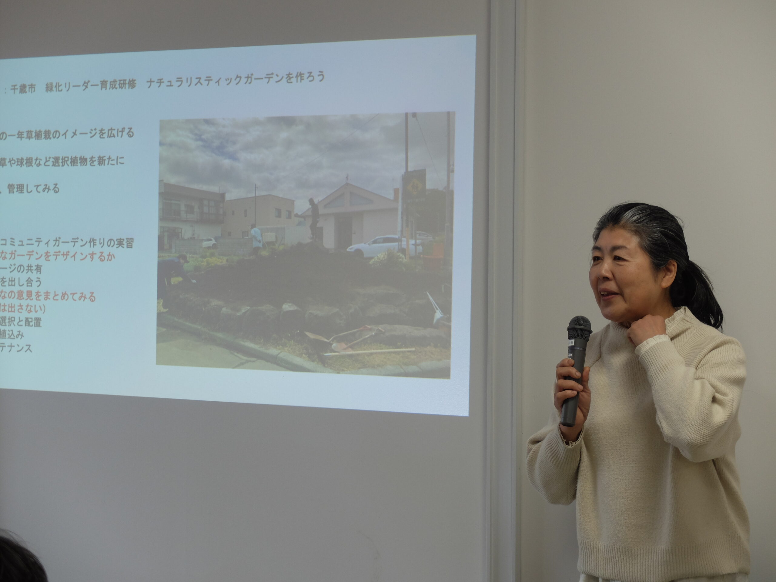 講師は恵庭の道の駅に隣接した「はなふる」のガーデン「虹色の鳥」を設計し、現在「はなふるガーデン」の管理など、花のまち恵庭のキーパーソンとして活躍されている株式会社サンガーデン取締役の土谷美紀さんに務めていただきました。