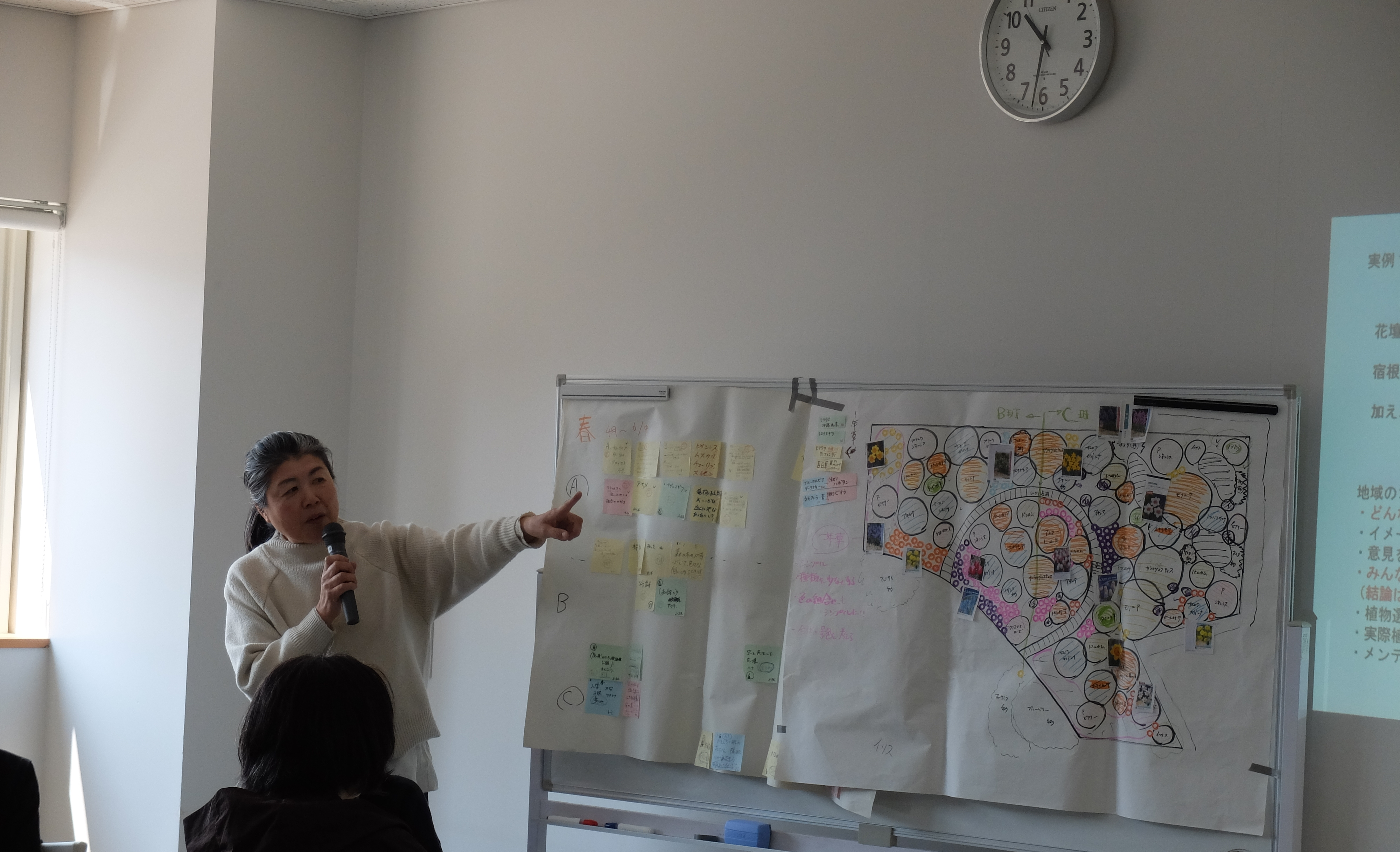 講義では、地域のコミュニティガーデン、「はなふる」のみんなの花壇、北海道ボールパークのサポーターによる花壇のほか、本講座で受講者のみなさんが携わる百合が原公園のウェルカム花壇など、土谷さんが手掛けた花壇デザインのさまざまな実例を紹介しながらデザインの配置、植物選び、メンテナンス方法などを学びました。