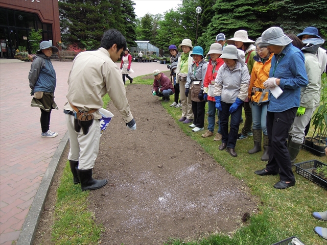 土はすでに堆肥をいれて耕してありましたので、みなさんで肥料をばらまき、レーキやシャベルで土になじませます。