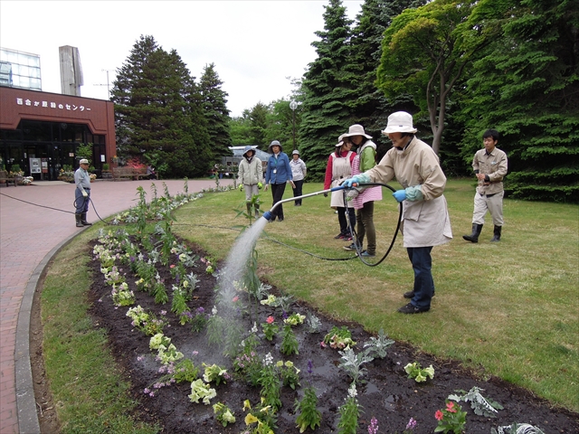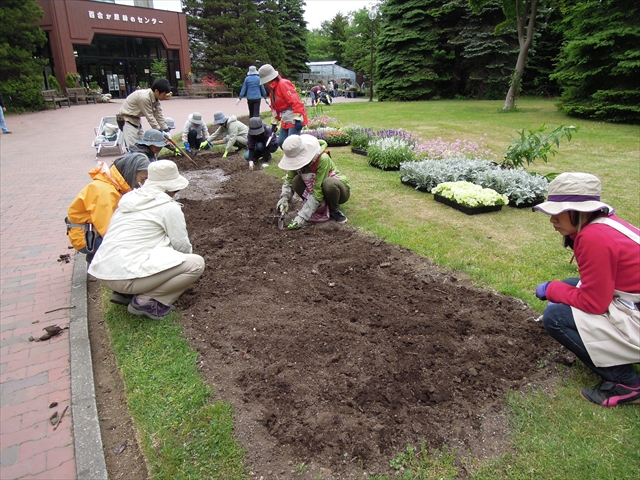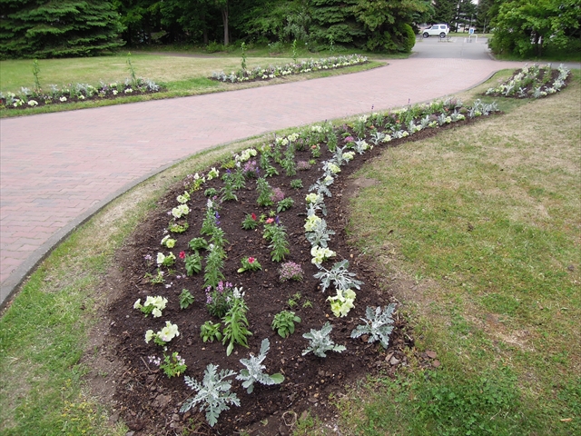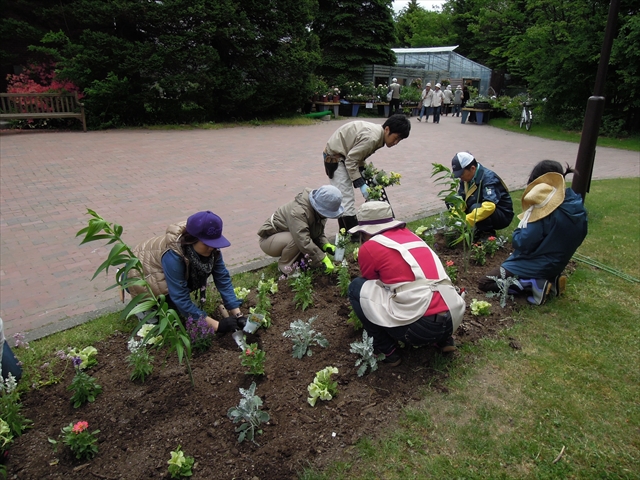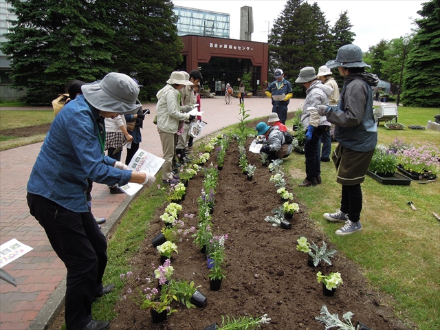 百合が原公園の温室前には、花壇が5カ所あります。とても目立つ場所にあるこの花壇で、一年草の植え込み実習を行いました!第二駐車場から園内に入ってくると、まず目にとびこんでくる花壇です。