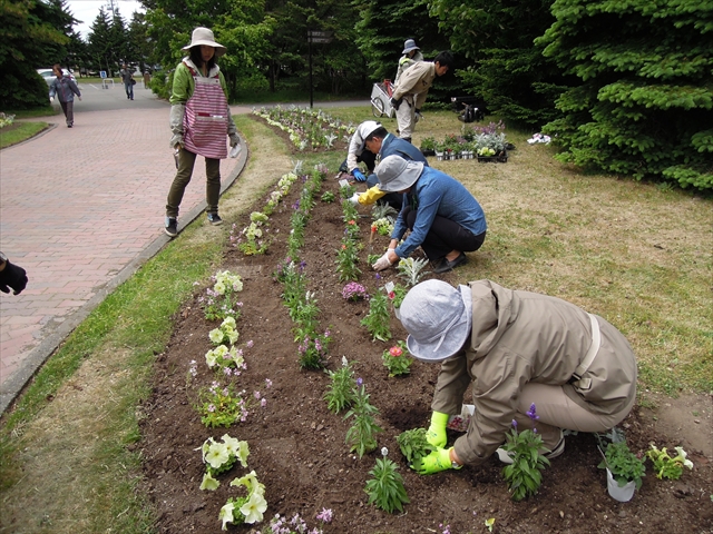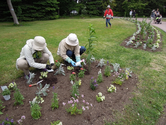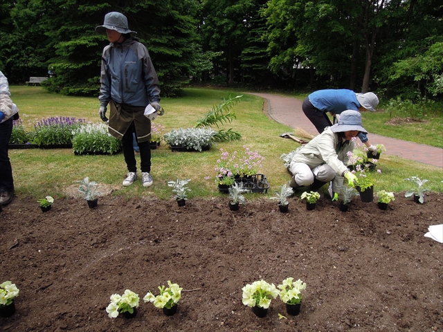 午後は、残りの2カ所にも同じように植えていきます。クネクネとカーブしてるから、少し大変ですね。真ん中の2列から植えると、外側を植える時に邪魔にならないそうですよ。