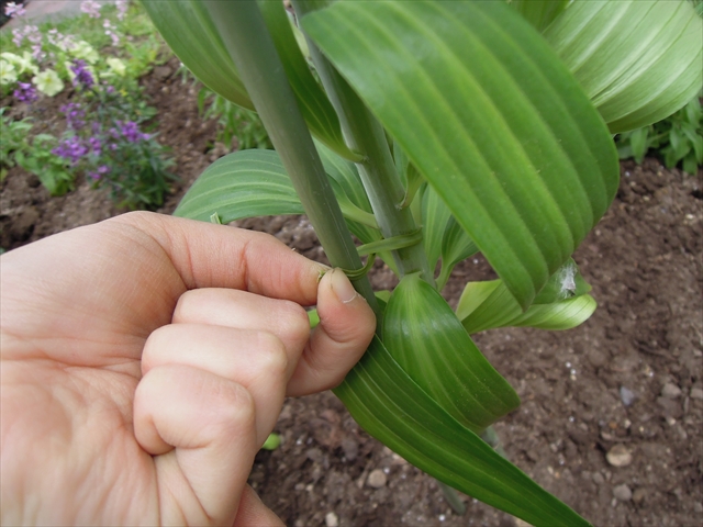 全体をみて、場所がきまったら植えていきましょう。ユリは球根の植物なので、深い穴をシャベルで掘ってから植えます。ヒョロっと茎が長くなっていて風に負けそうだったので、支柱を立てました。八の字に2カ所固定します。