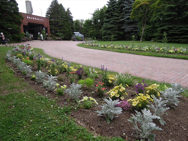 花壇には、植物の紹介看板が設置されています。”このボーダー花壇は、「さっぽろまちづくりガーデニング講座」受講生が植栽しました。”