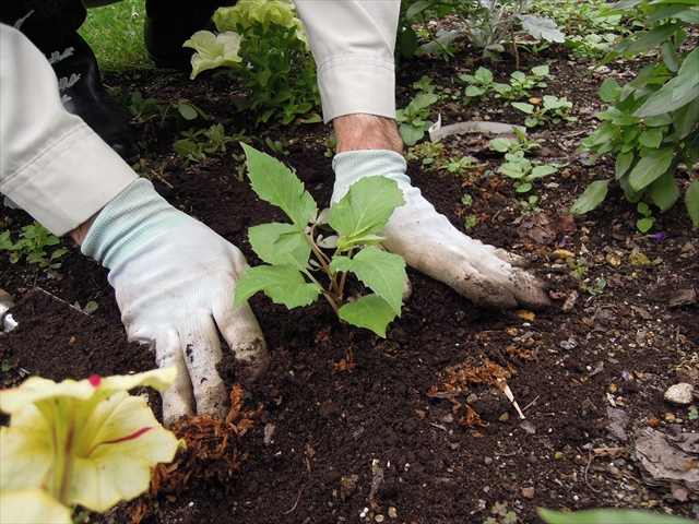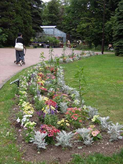 先月、ガーデニング講座で受講生が植えました百合が原公園の温室前花壇。だいぶ盛り盛り大きくなってきました。今日はそこにダリアを補植しました。
