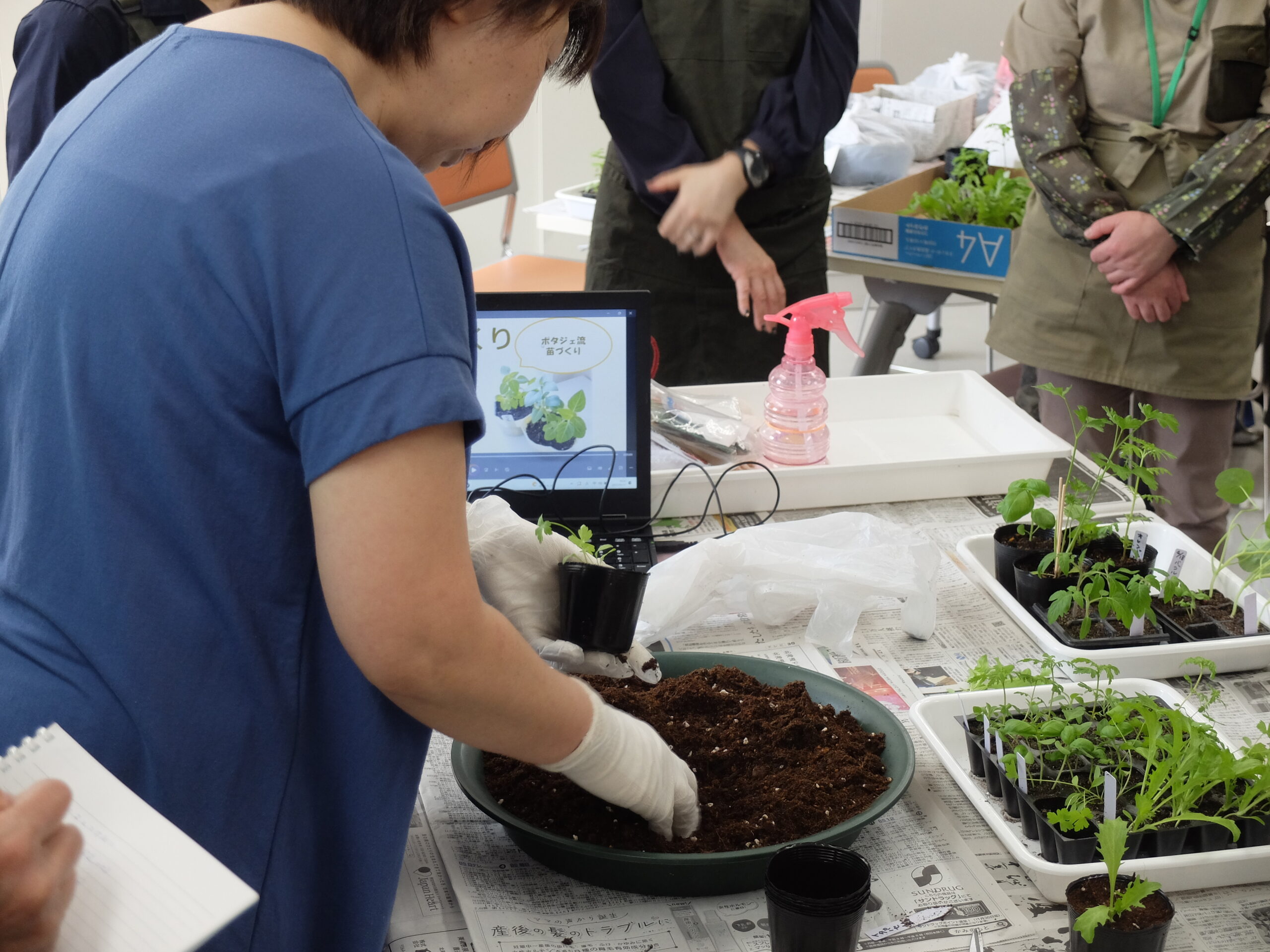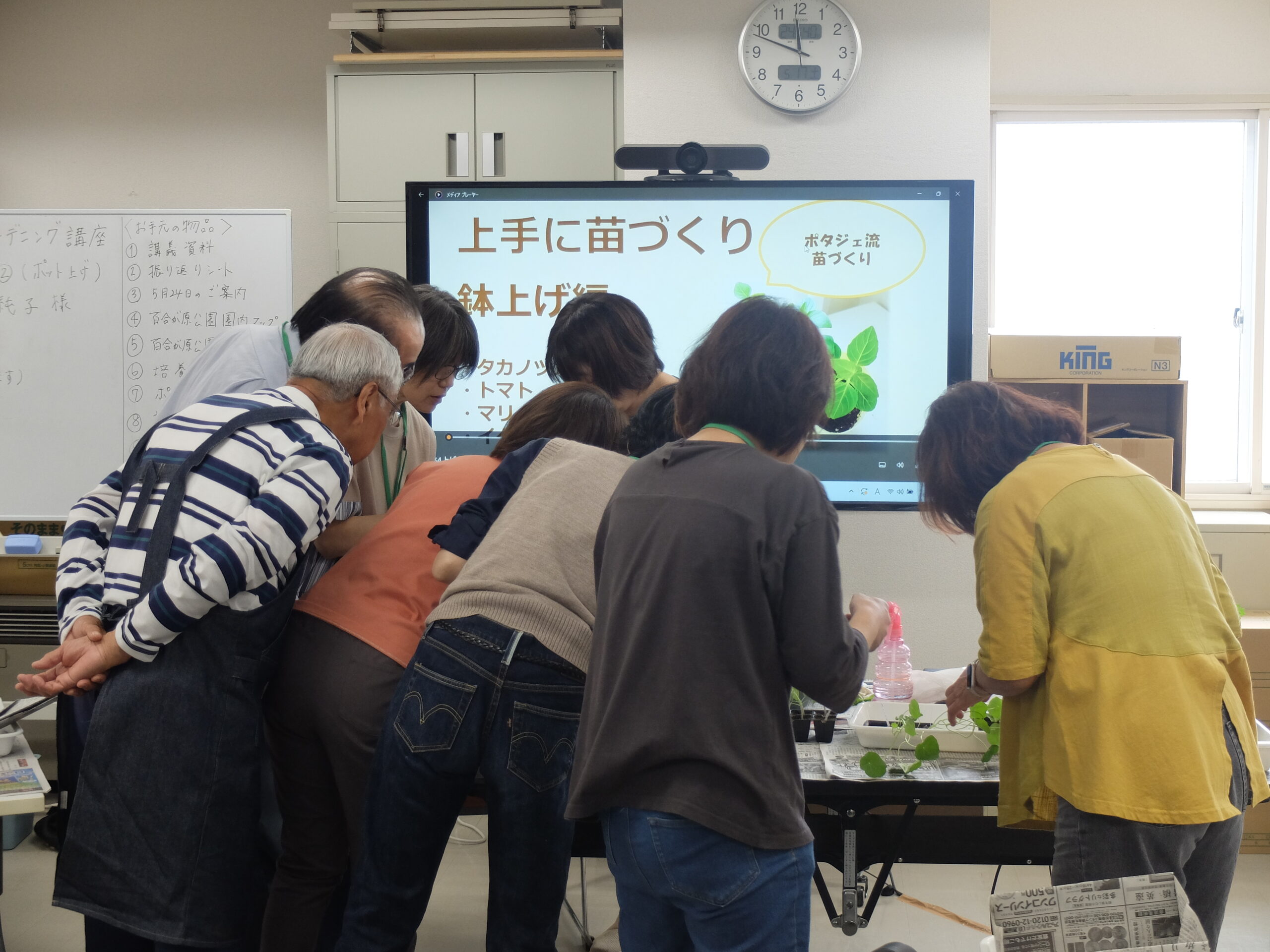 講師のまわりに受講者のみなさんが集まって、ポット上げの手順を間近で観察します。土の深さや鎮圧する加減、苗がぐらついているときの対応方法など受講者のみなさんの質問に答えながら植物の生育状況に合わせた方法を教えてくださいました。