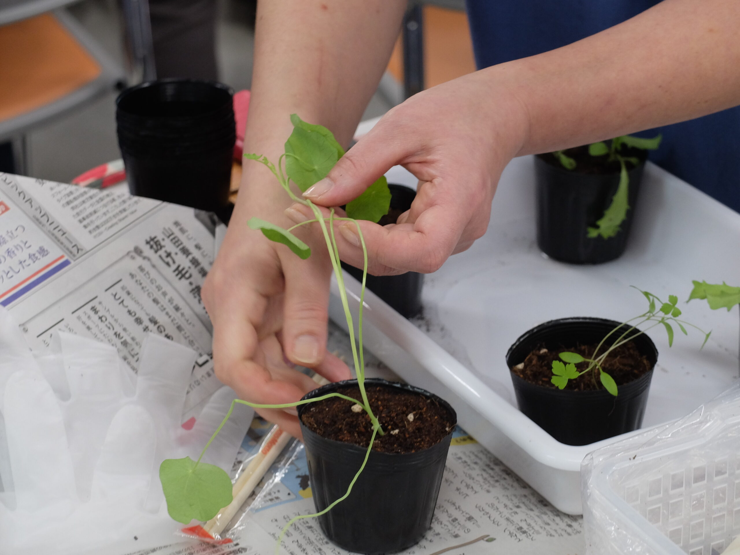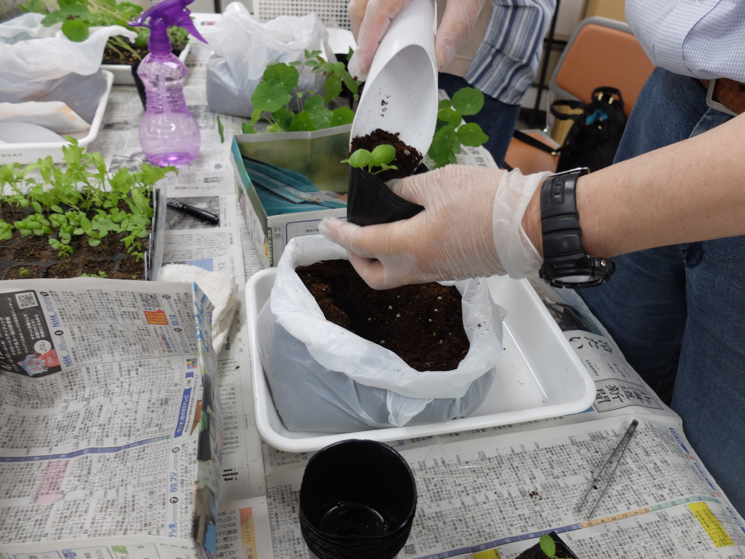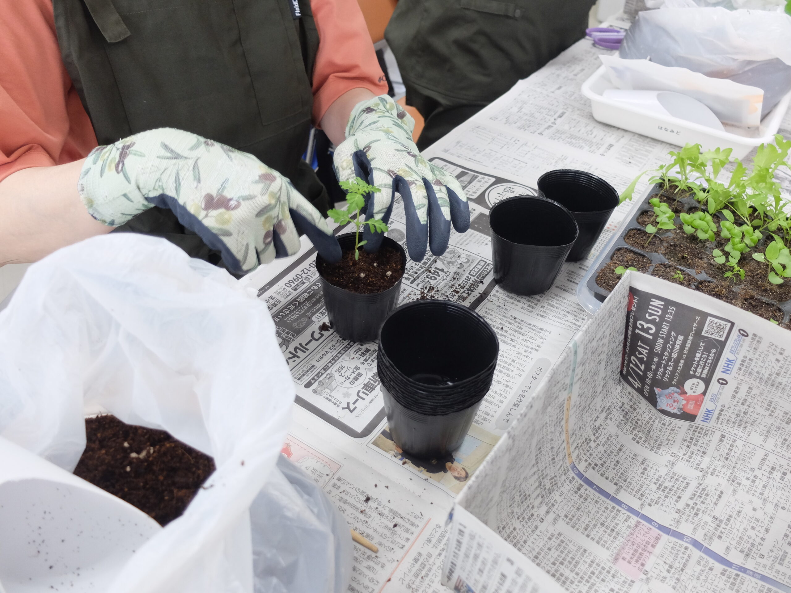 しっかり学んだ後は、各自が育ててきた苗のポット上げを実践します。
