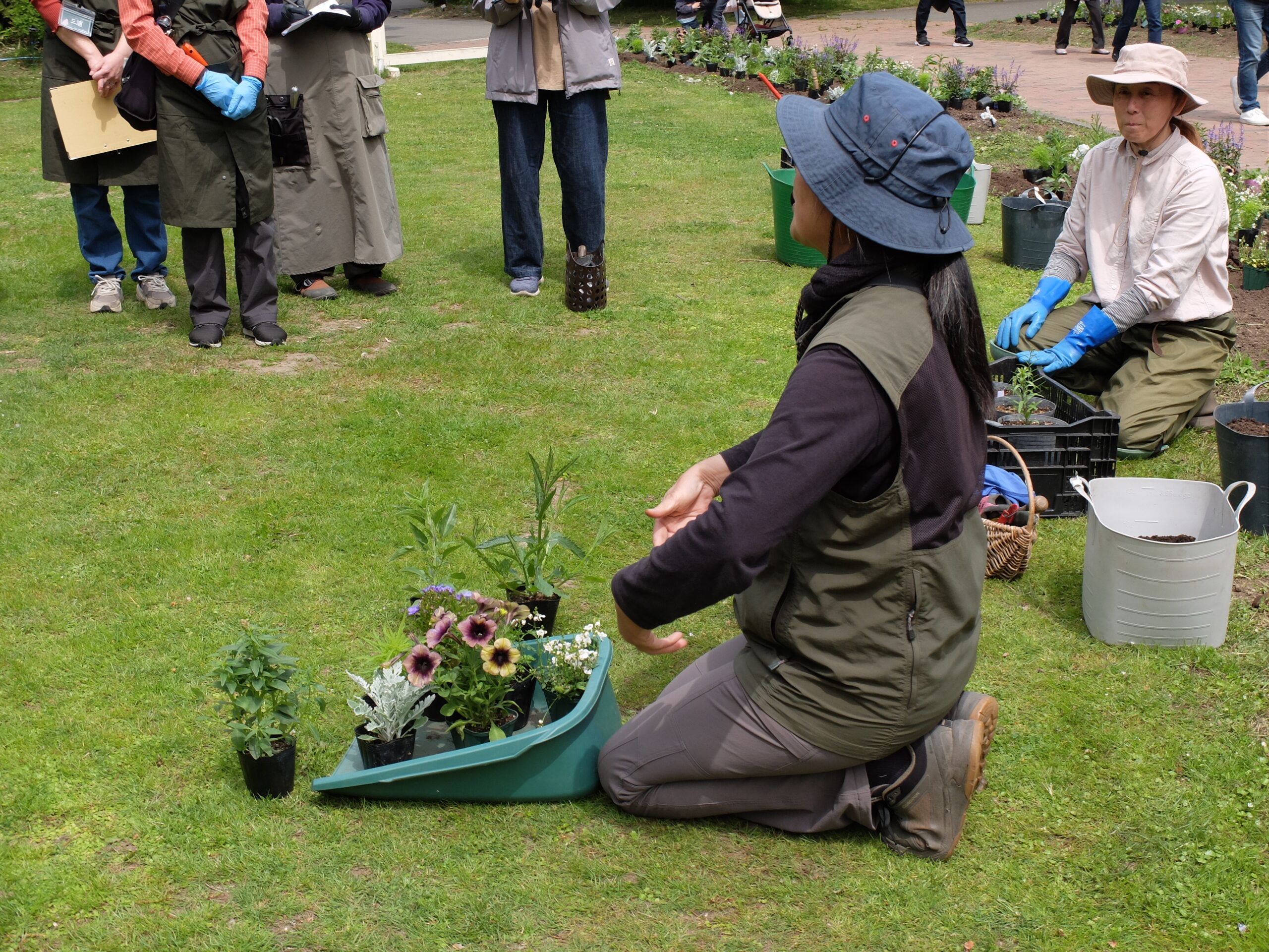 最初は躊躇しながら花を摘んだり、不安な表情で植えたりしていた受講者のみなさんでしたが、講師の土谷さんや菅田さんに質問しながら、普段植えることないたくさんの花苗を植えたことで自信につながったと話されていました。