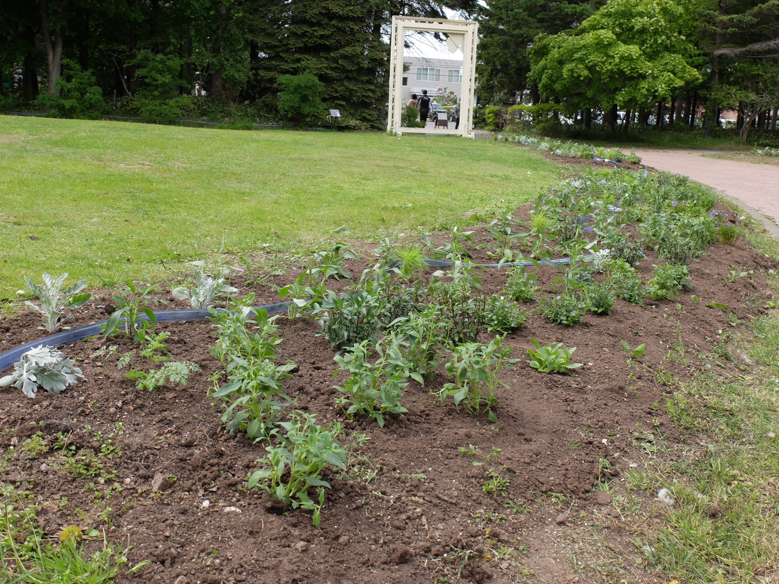 すべての苗を植え終わった花壇は緑一色の少し寂しい花壇になりましたが、月日を経るごとに生長し、彩り豊かな花壇に変化していくことでしょう。