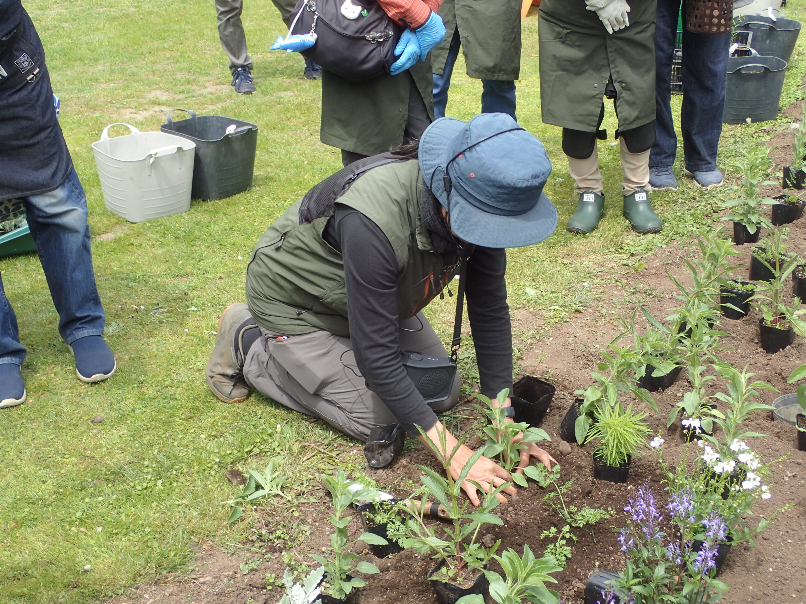 ひと通りの説明の後、「花色と葉の色を組み合わせて配置しているので、みなさんも植え付けながら花苗の配置を確認しながら植えていきましょう。」との講師の声に、みなさんそれぞれ花壇へ並びます。
