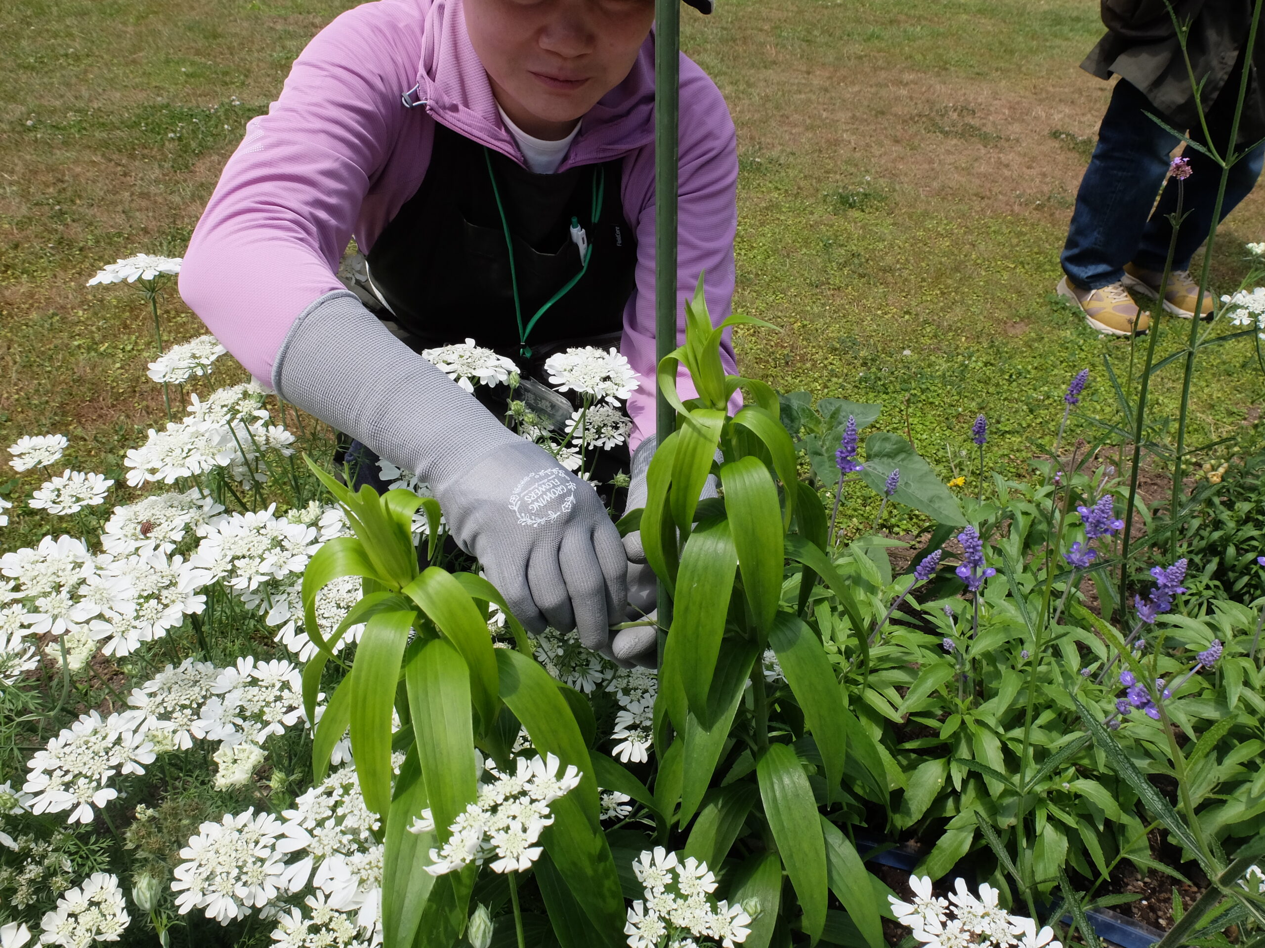 花壇には大ぶりの花や、小さな花が集まったものなど様々な種類の植物が植えられており、それぞれに適した摘み取りのタイミングや方法があります。講師からは資料とデモンストレーションを使って、丁寧な説明がありました。