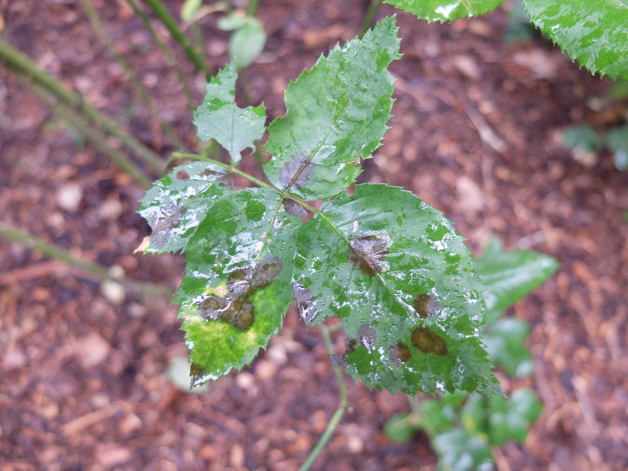 数あるバラの中には、黒星病を発症している株もありました。黒星病は梅雨や長雨の時期に発生しやすく、土に常在するカビ菌が雨の跳ね返りで葉につくと発症します。その予防として、百合が原公園では地面にウッドチップを敷き詰めていました。