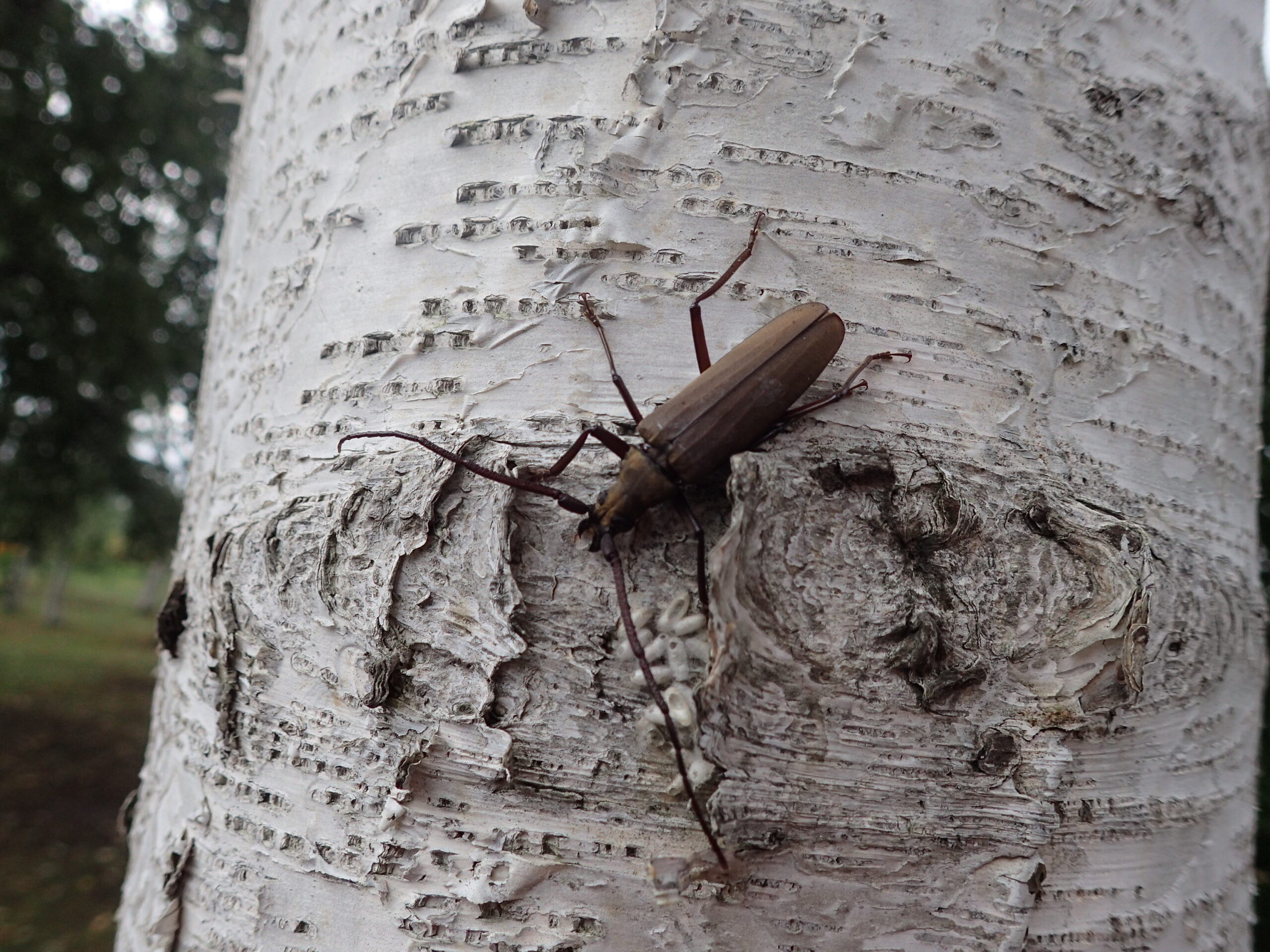 こちらのシラカバの木の根元には空洞ができています。これはカミキリムシの幼虫が木の内部を食い進んだ跡です。幼虫は幹や芯となる木材をかじり、徐々に穴を広げていきます。更に木の腐朽が進むと弱って枯れてしまうこともあるそうです。講座では、ちょうど木の表面にいたカミキリムシを間近に観察することができました。
