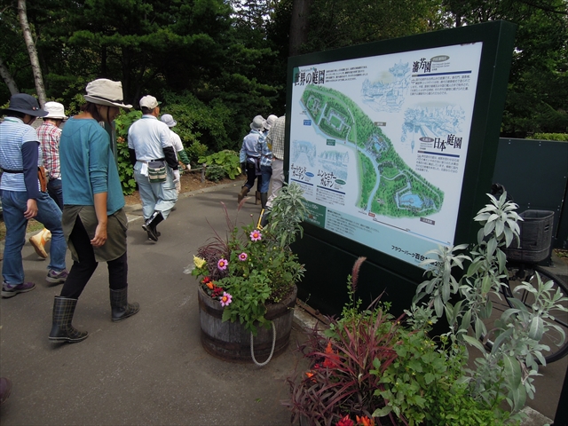 体がほぐれたところで、「世界の庭園」へ移動しました。世界の庭園は、5/17(土)の実習で作成したコンテナ花壇を設置した場所で、札幌市の3つの姉妹都市を代表する庭園と、日本庭園で構成された有料エリアです。