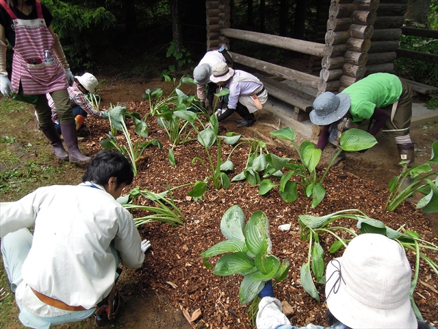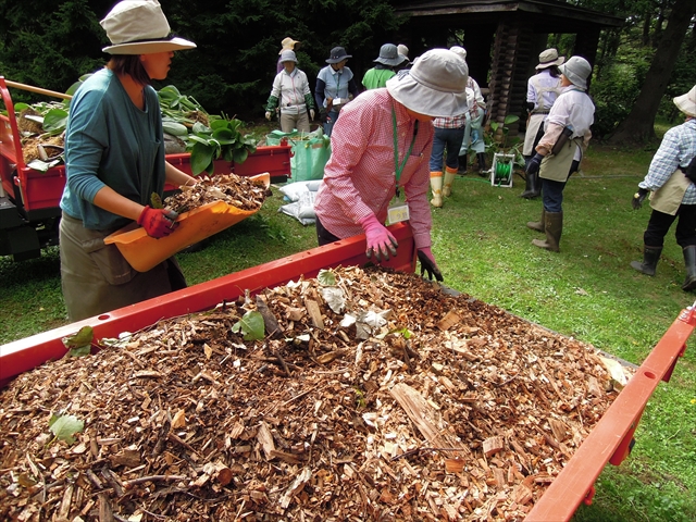 実習では時間の都合上、ここの一部のみ株分けをし、残りはスタッフが行うことにしました。さきほど同様、土の上にウッドチップを敷き詰めまして