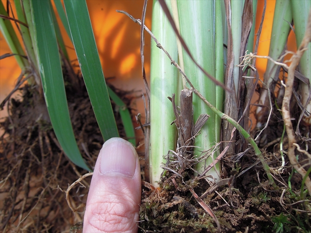 親指くらいの幅に生長したものを株分けします。選抜メンバーを決めているところ。ベンチ入りはこのコにしよう。