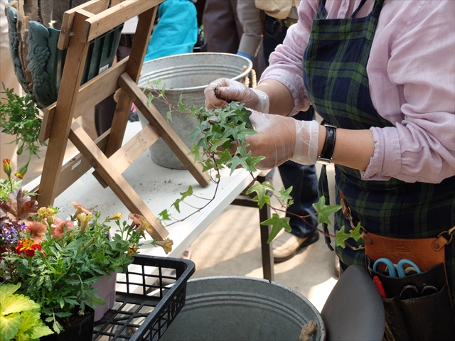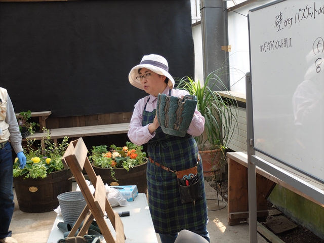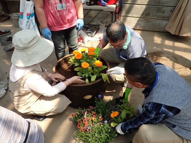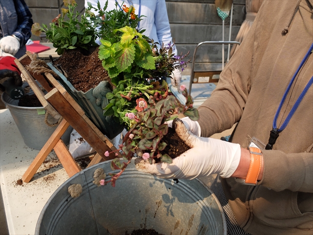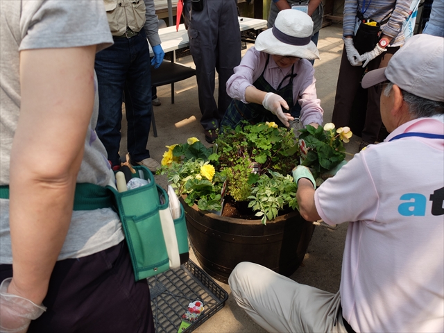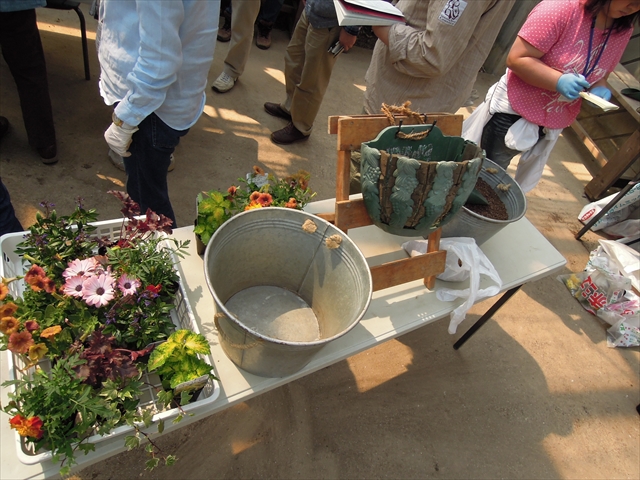午前中はコンテナ花壇の作成、午後はハンギングバスケットの実演と実習をしました。