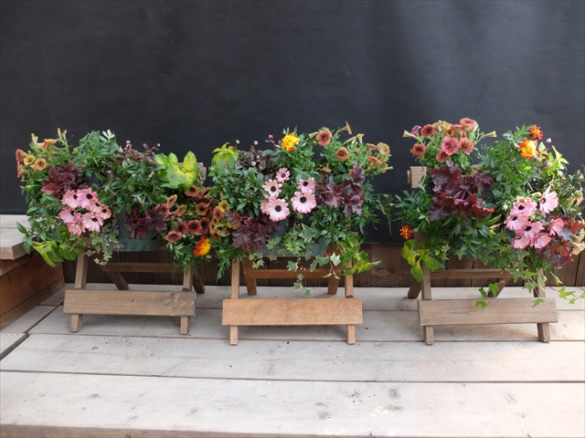 宮崎先生と受講者の皆さんが作ったハンギングバスケットたち。