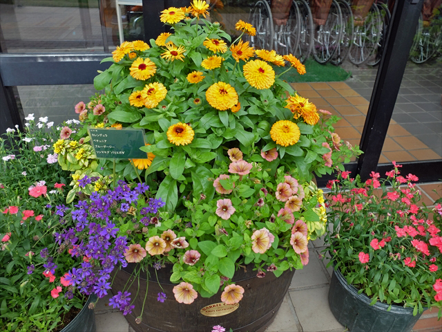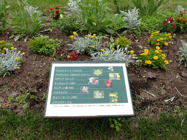 花壇の前には花の名前が画像入りで分かりやすく表示されています。