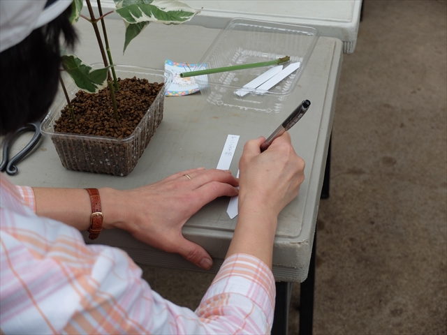 挿し床に種名や日付を書いた札を挿すことも忘れずに。