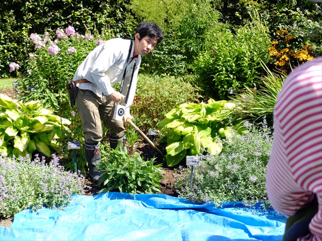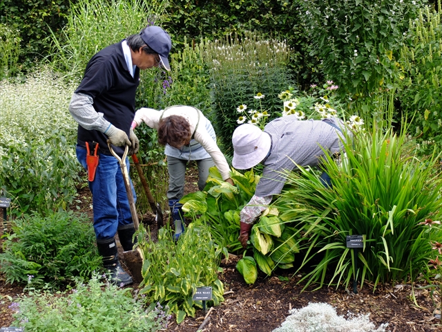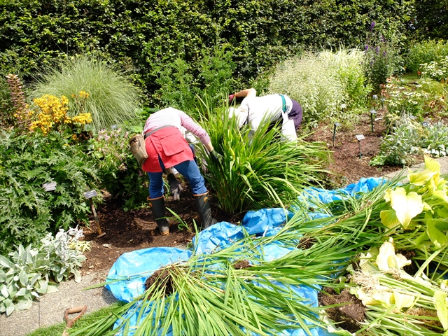 テーマは「宿根草管理(株分け)」です。午前中はビーチヘッジのギボウシとクロコスミアの株分けをしました。