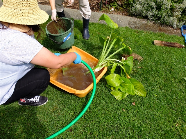 掘り上げた株にはたくさん泥がついています。水でじゃぶじゃぶと泥を落としていきます。