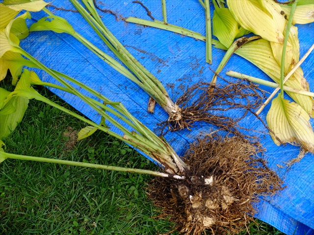 まず、大きくなったギボウシの株を掘り上げます。