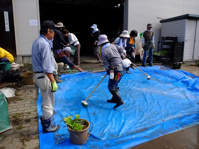バケツで水を運ぶ人、株の根を洗う人…、実習の回を重ねるごとに受講者さんたちのチームワークがどんどん良くなっています。