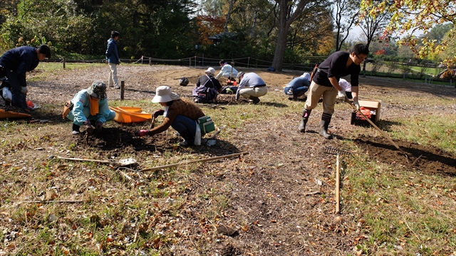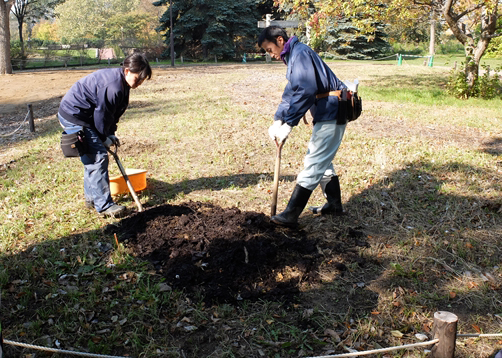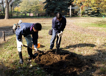 テーマは「球根類の管理」、サイロ展望台周りにチューリップの球根を植えていきます。